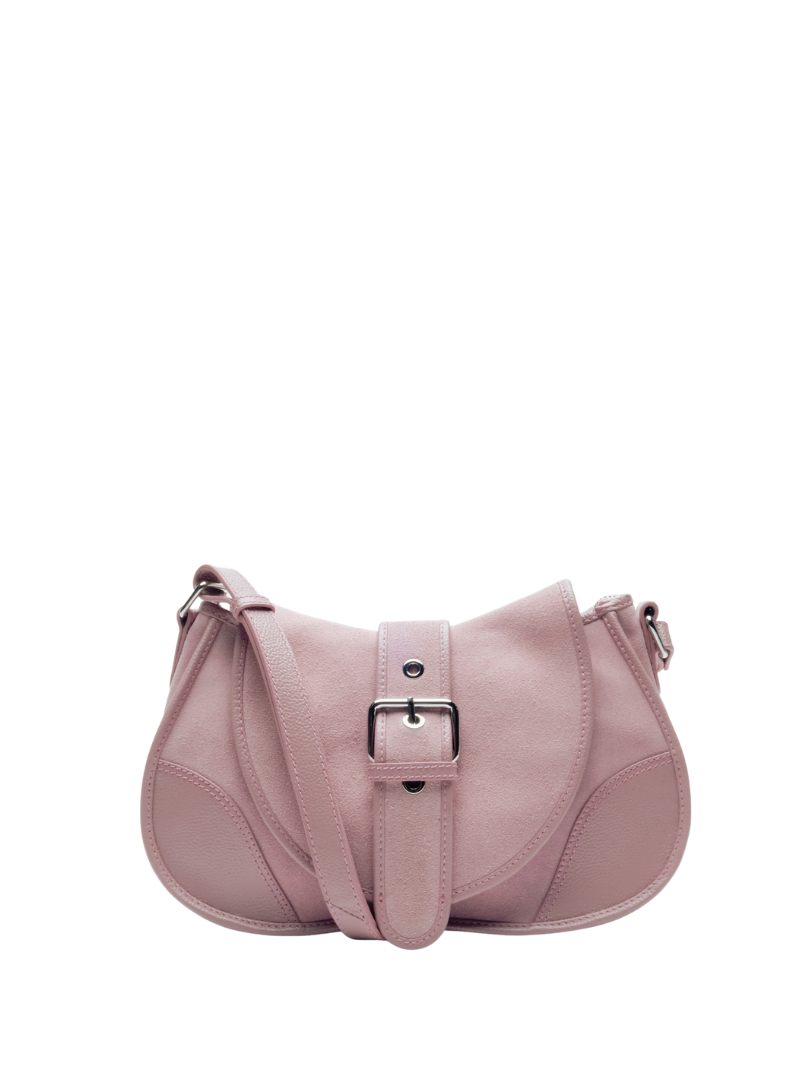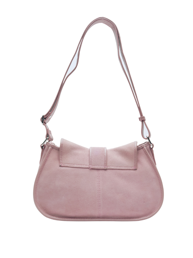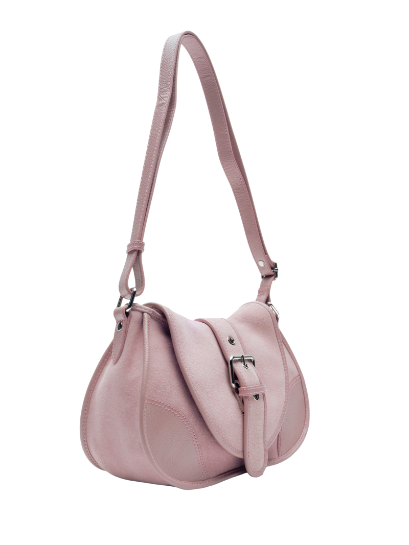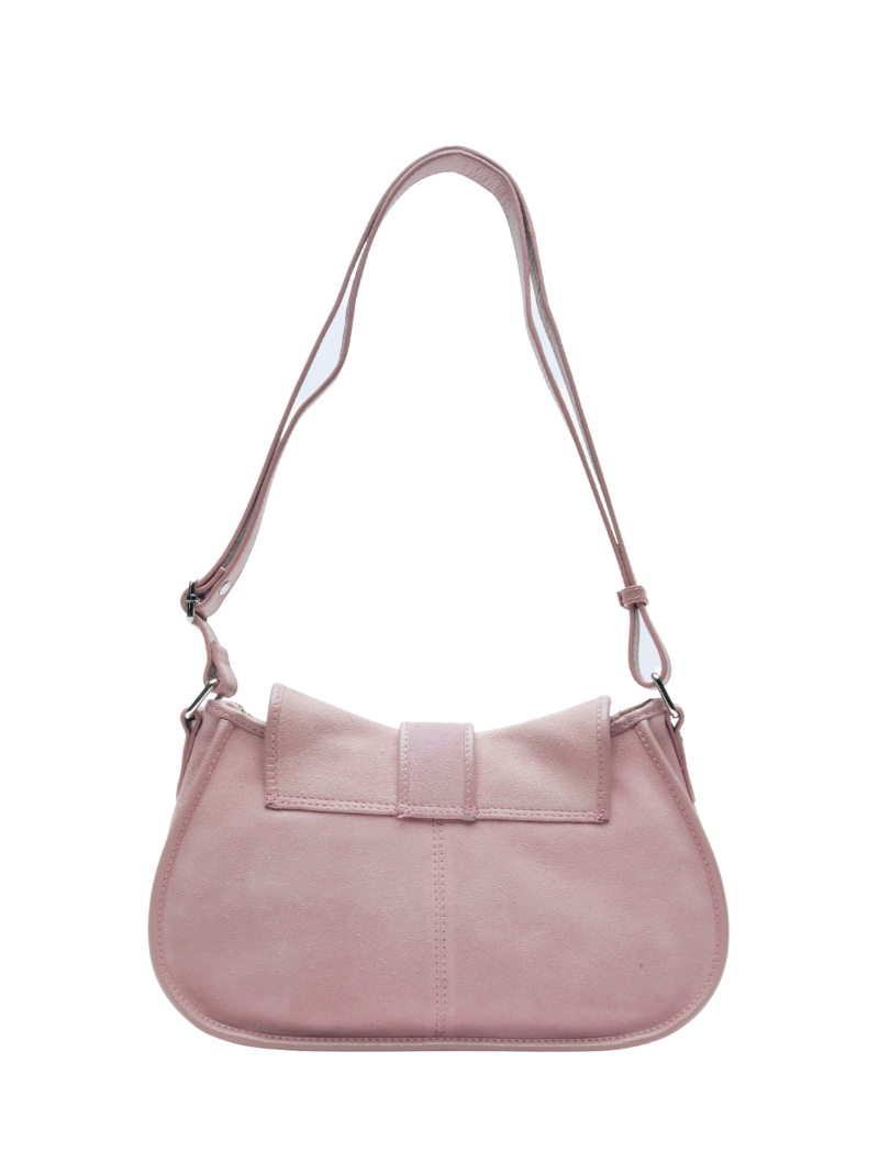 Medium pastel pink suede bag with a metal buckle on the flap and an adjustable strap. A bag with a curved silhouette and elegant design, ideal for everyday use.
