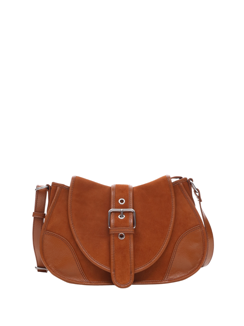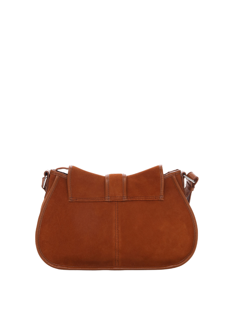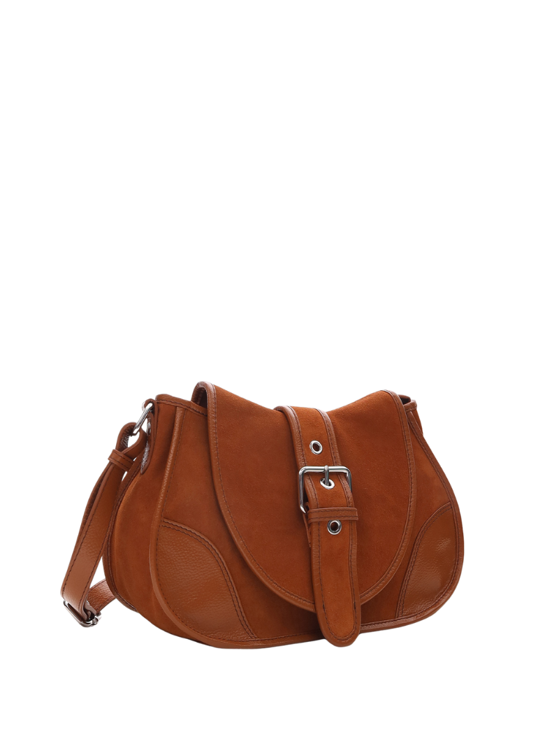 Medium-sized suede handbag in walnut brown, with a metal buckle on the flap and an adjustable strap. A bag with a curved silhouette and elegant design, ideal for everyday use.