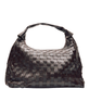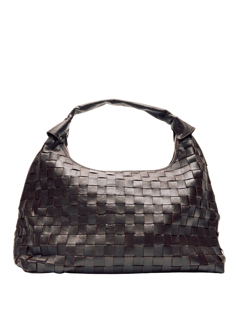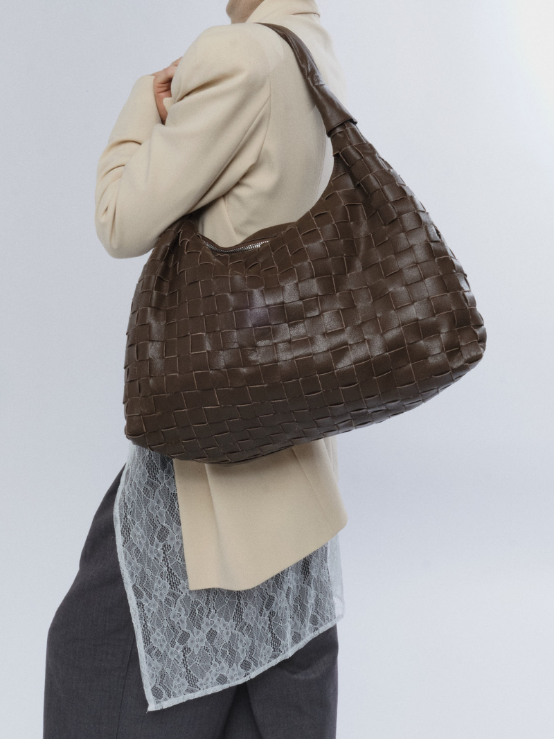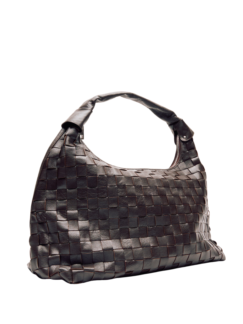 Large shoulder bag, made of braided leather in chocolate brown and with a rolled handle at the top.