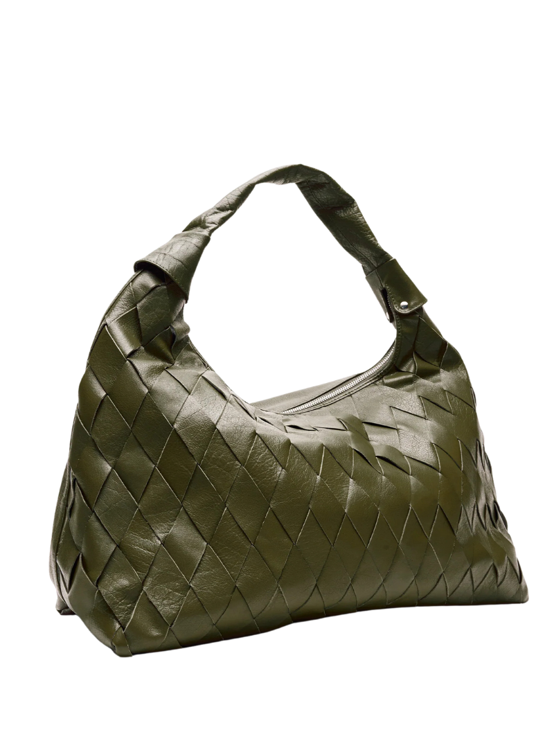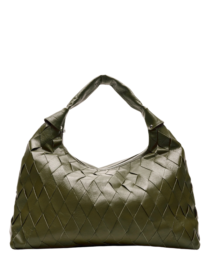 Large shoulder bag, made of olive green braided leather and a rolled handle at the top.