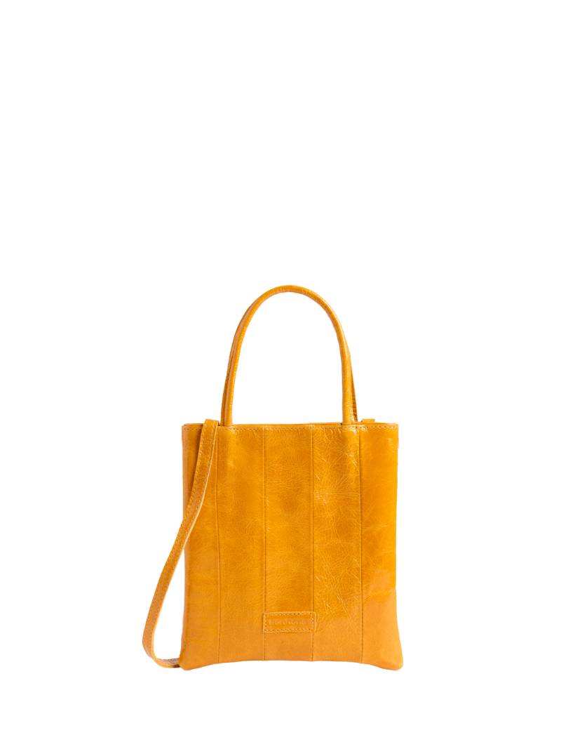 Small leather bag in orange curry color handmade in Spain with a modern design. Thanks to the adjustable strap, it can be worn both on the shoulder and across the body, perfect for any style.