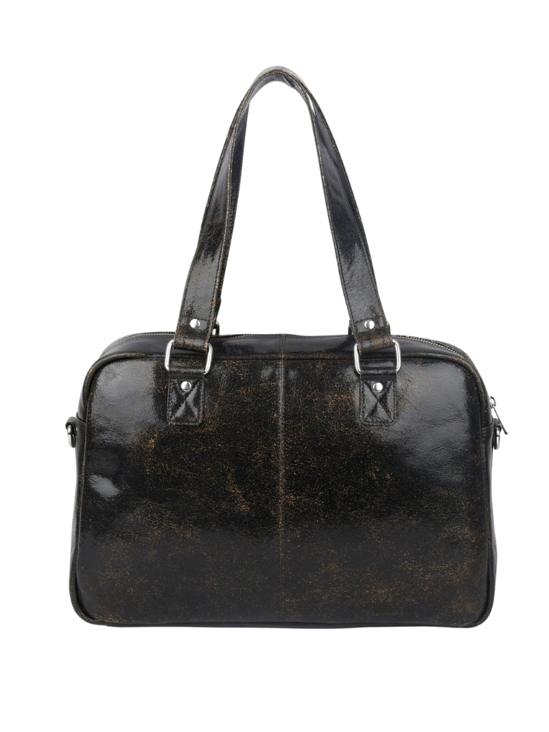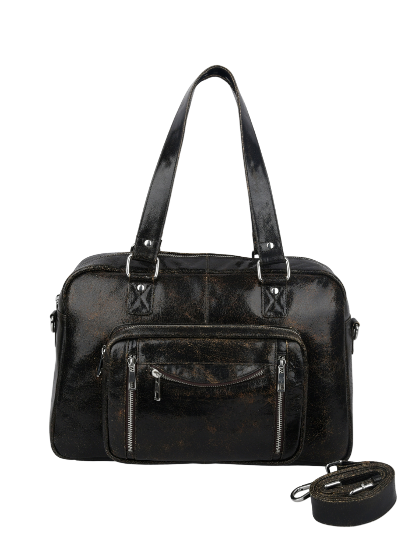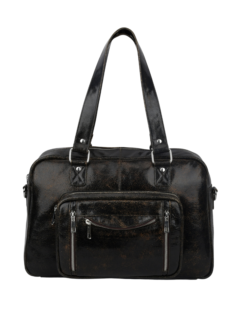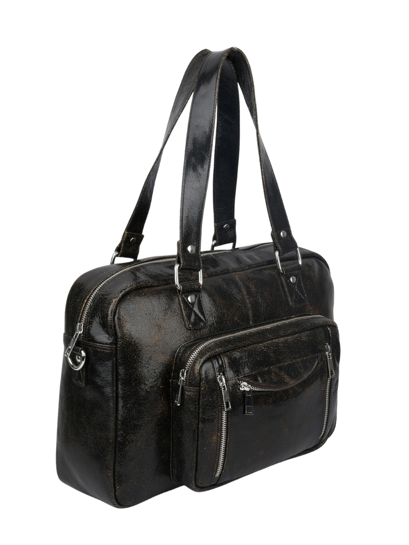 Maxi leather bag, in worn black with brown details, with handles to carry by hand and with a shoulder strap to wear it across the body.