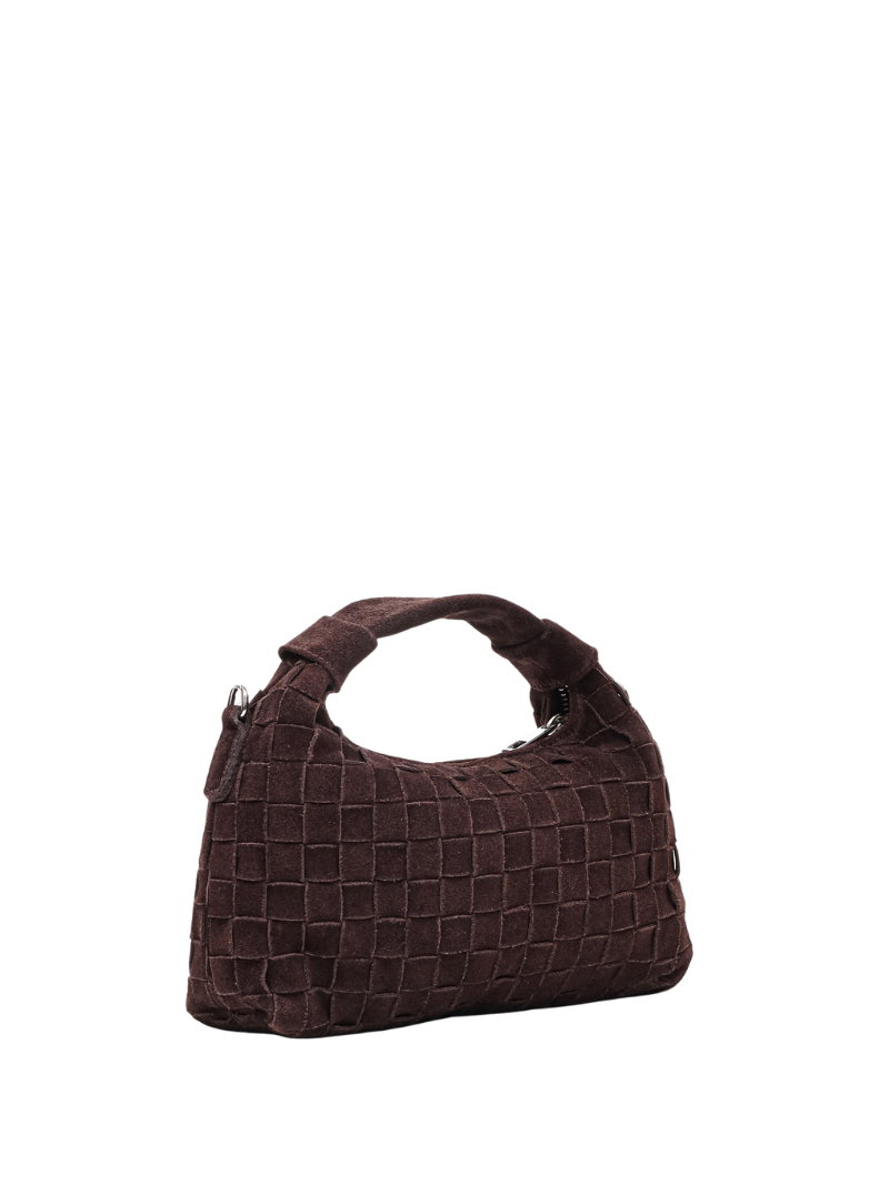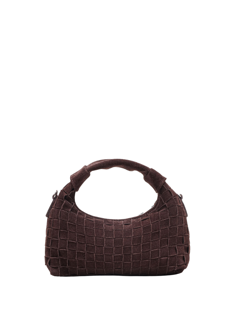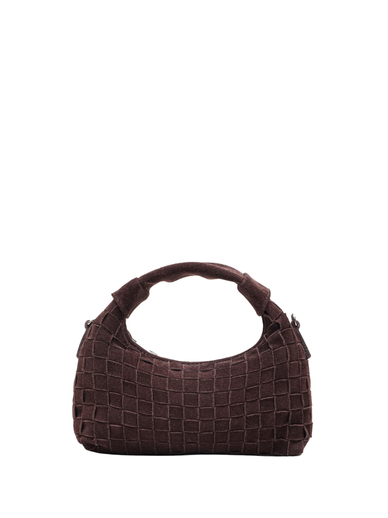 A small brown braided suede handbag, made of genuine leather, with a rounded top handle and a main compartment with a zip closure.