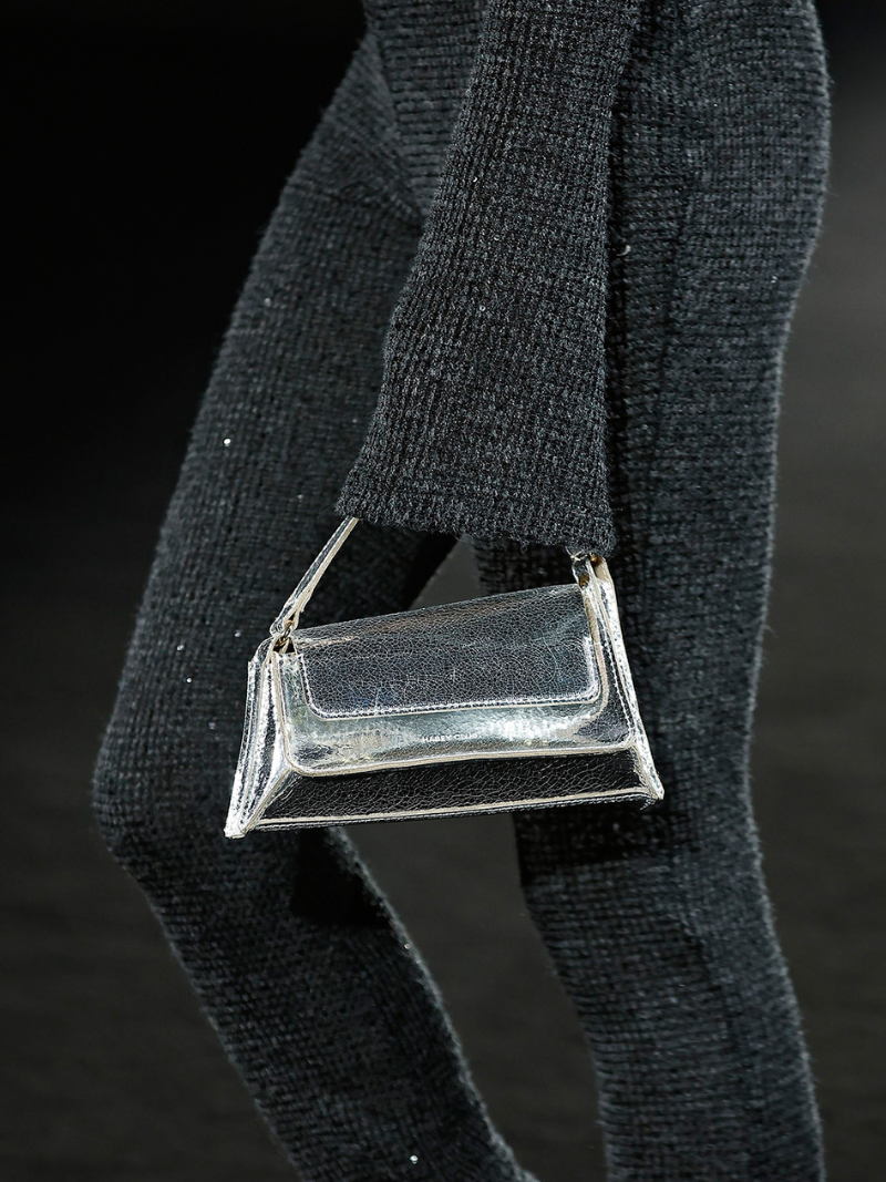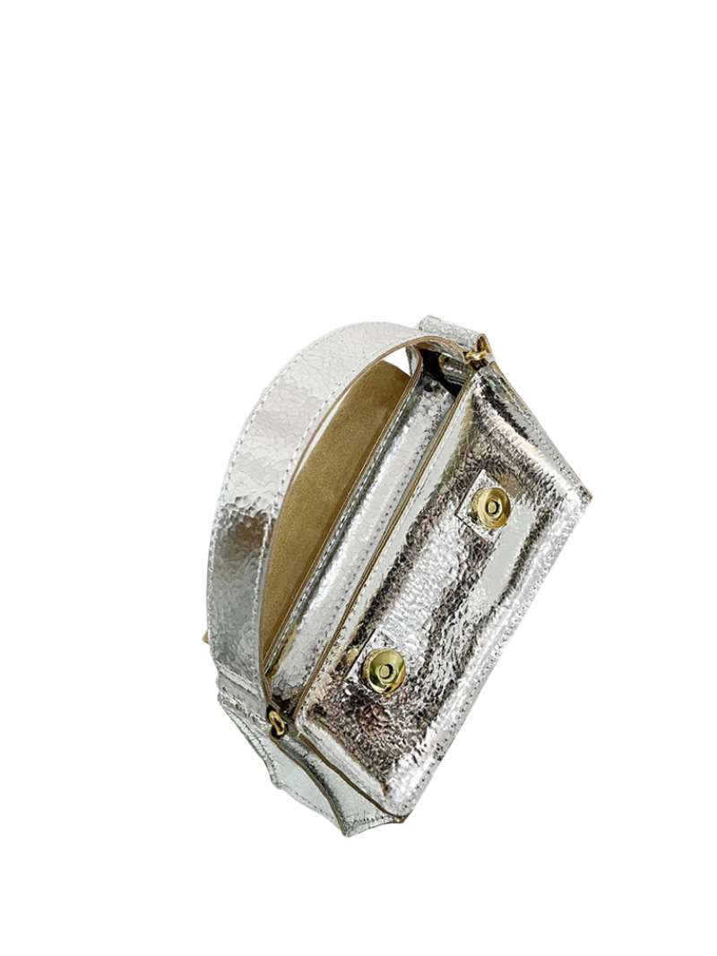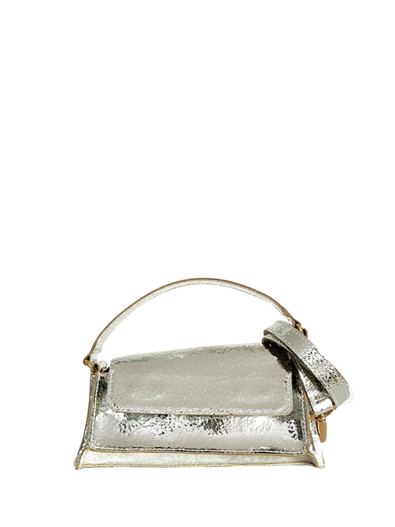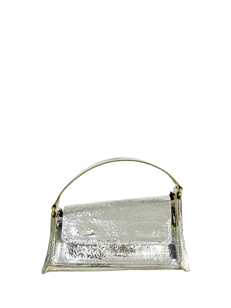 The Habey Club Minicrash Silver It is an elegant cowhide bag with a structured design and minimalist finish . Ideal as a small bag , Combines functionality and style thanks to its top handle and flap closure . Perfect for formal or casual looks , this silver bag of skin It is a timeless basic that elevates any outfit.