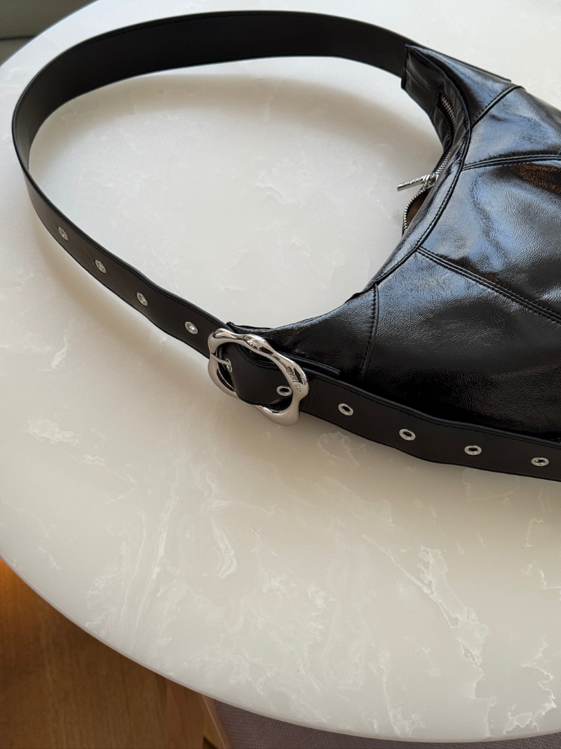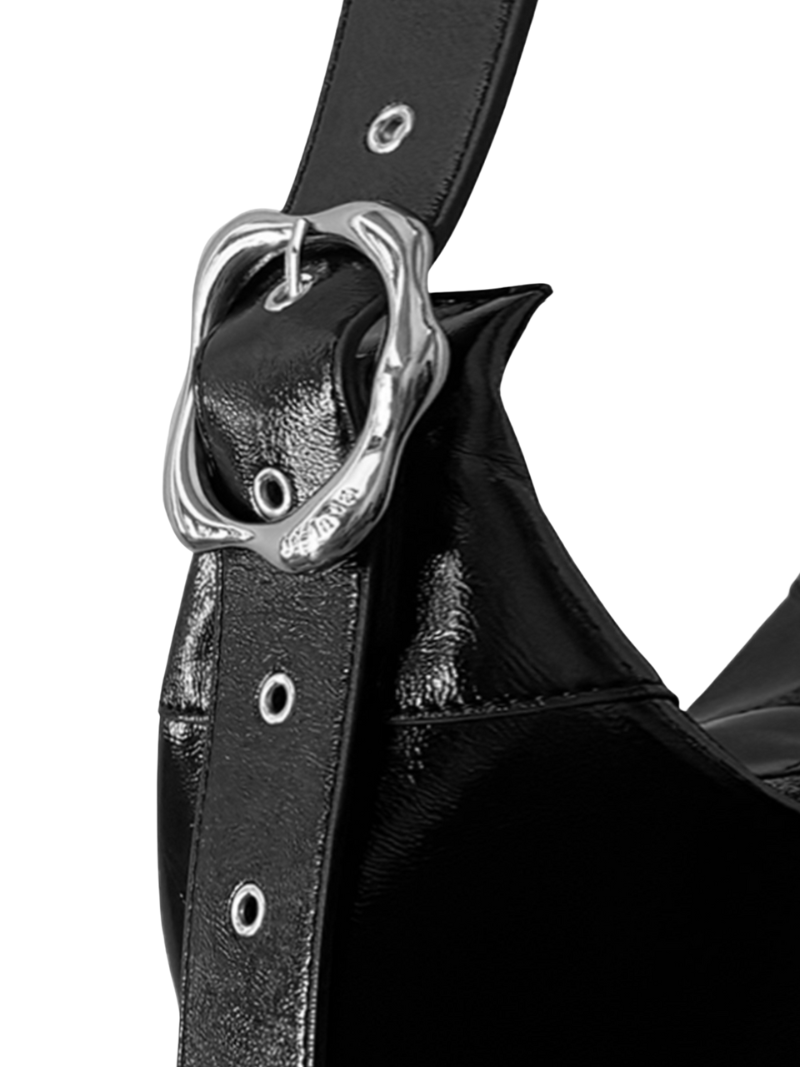 Medium oval-shaped shoulder or crossbody bag. Made of vegan nappa leather in glossy black.