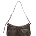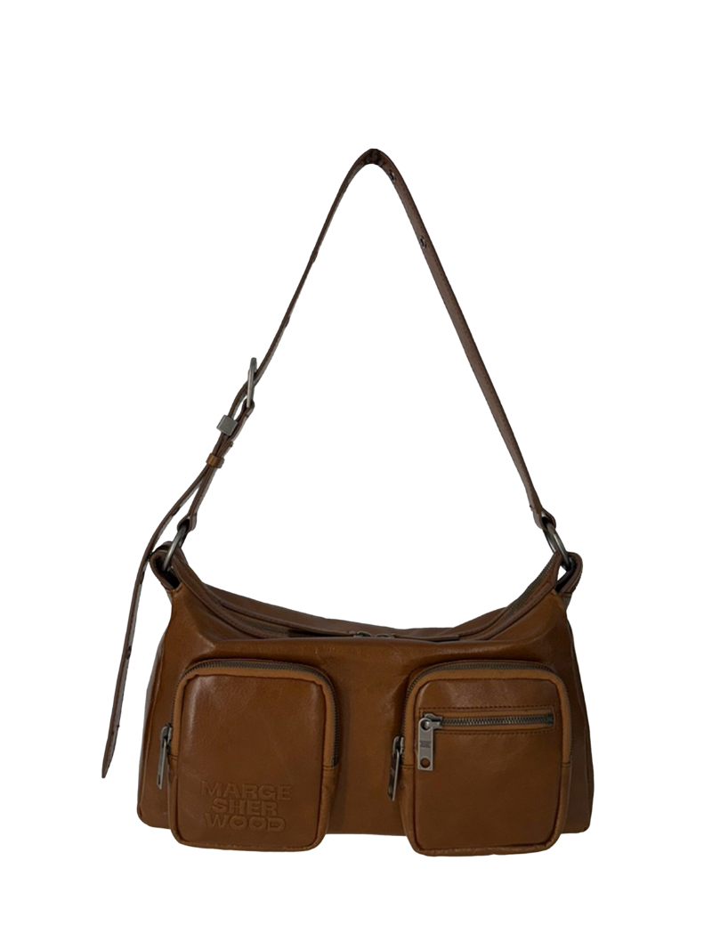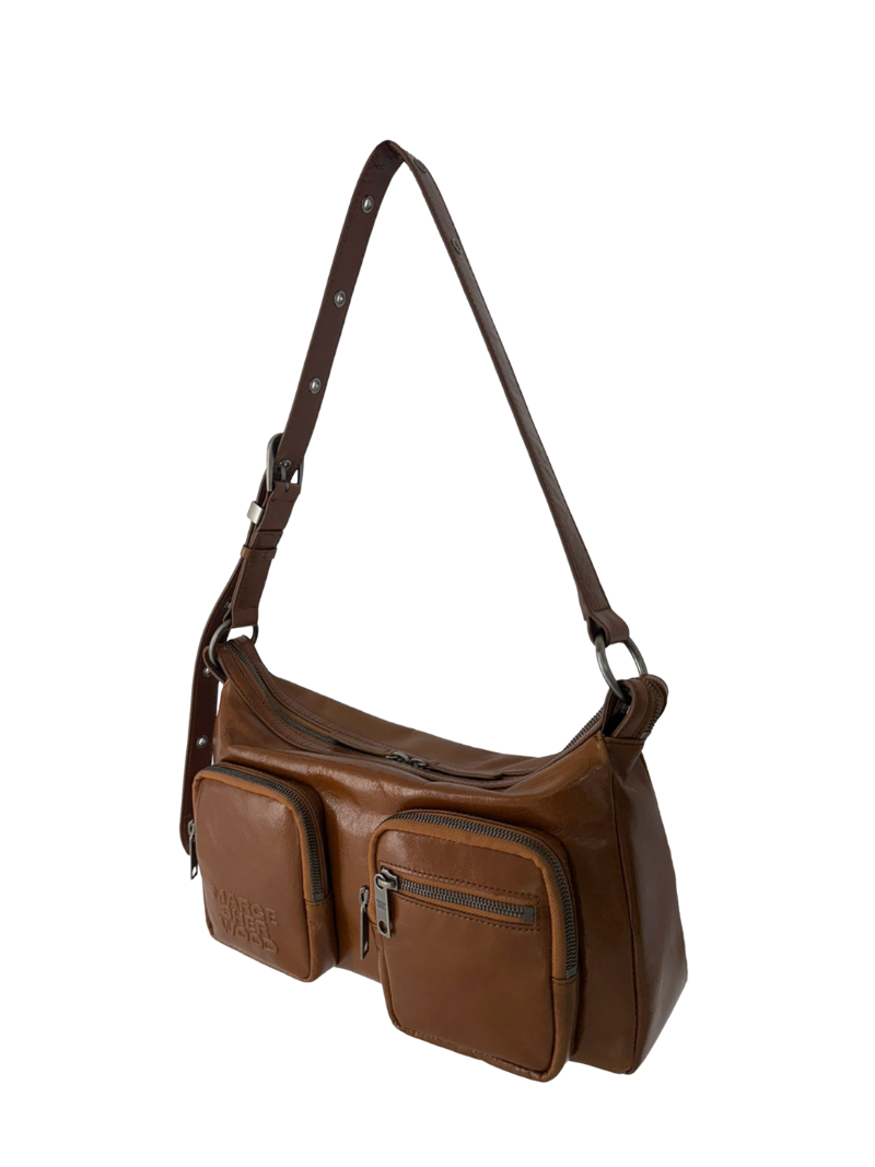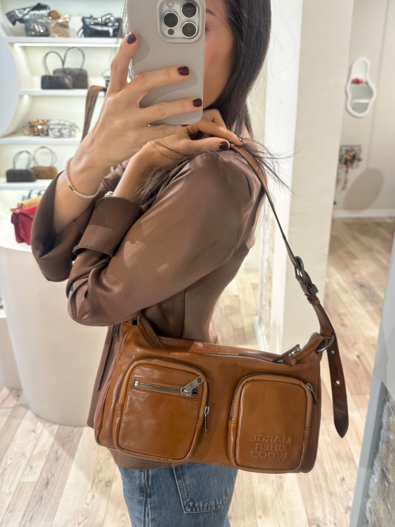 Medium brown leather bag with silver details. It can be worn over the shoulder or across the body thanks to its adjustable strap.