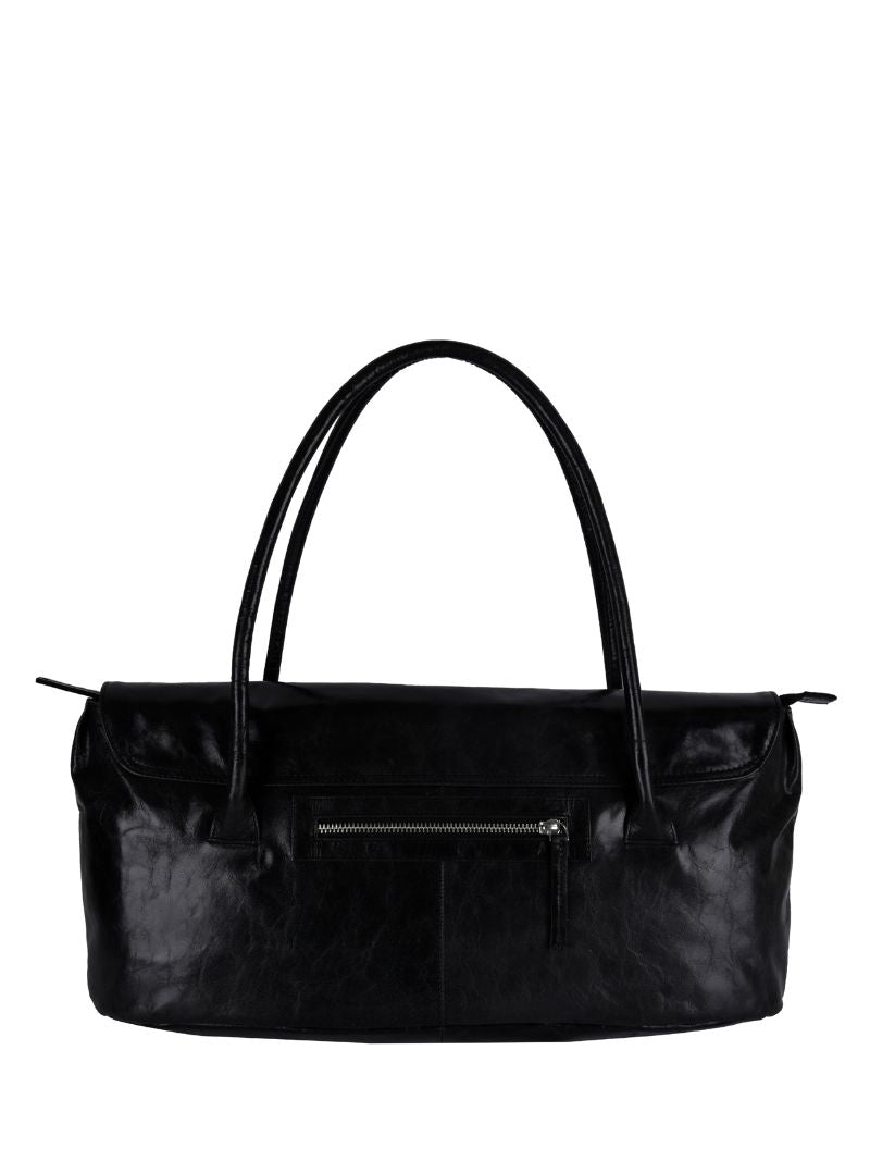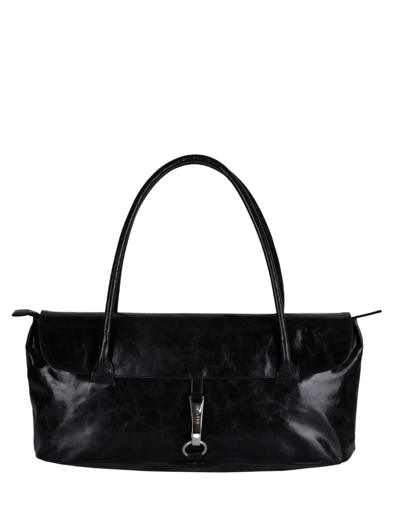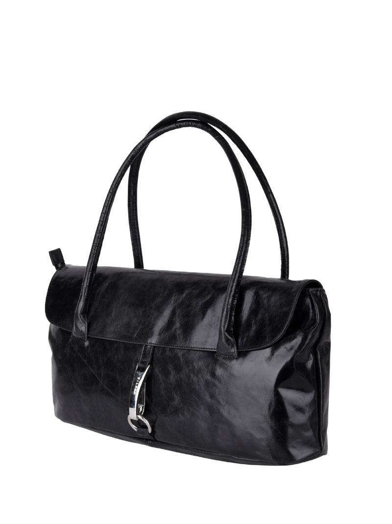 Black leather shoulder bag with a sleek, elongated design. Its double handles and metallic detail on the front add a sophisticated touch that elevates any look.