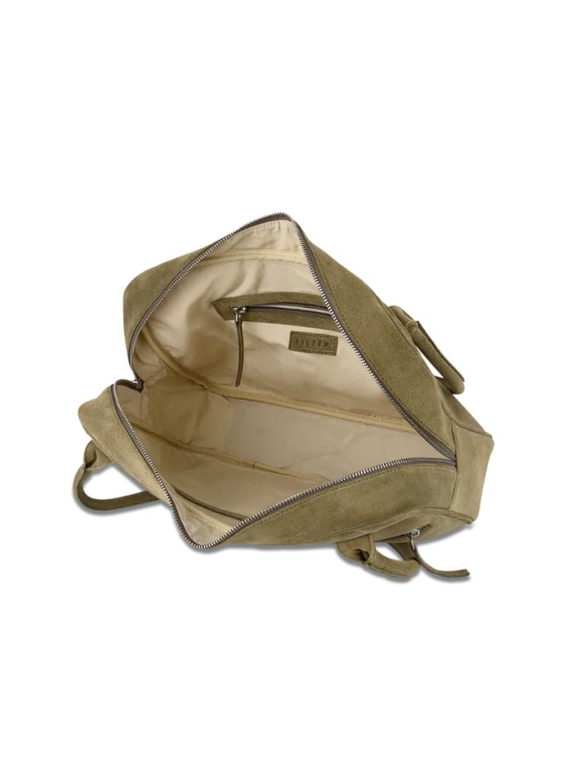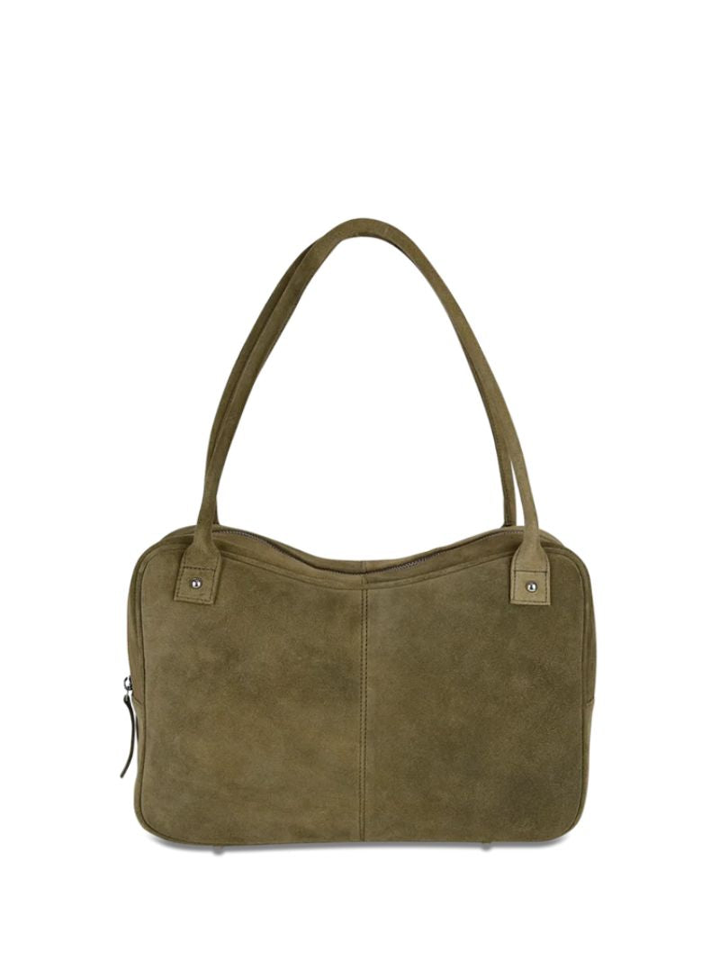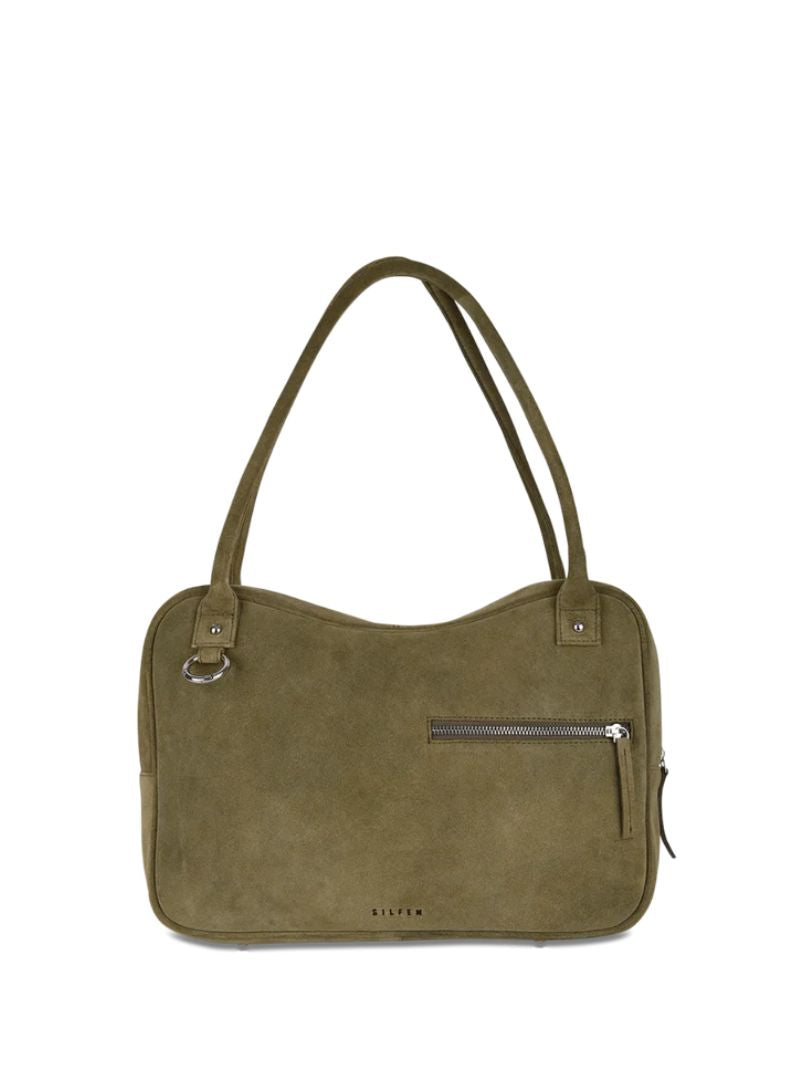Shoulder bag in olive green with a soft suede-effect finish, featuring a sleek rectangular and minimal design that goes with absolutely everything. Its double handles and metallic details add a sophisticated touch, while the exterior zip pocket gives it that practical edge that makes it perfect for everyday wear.