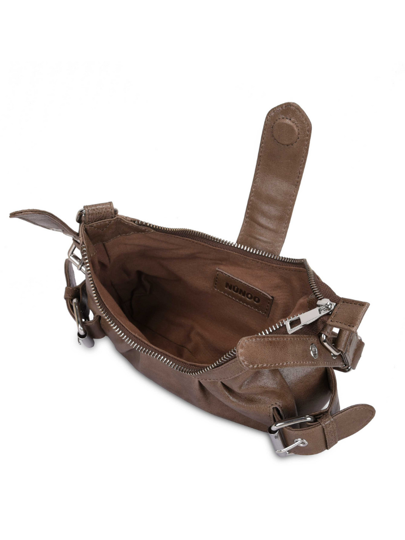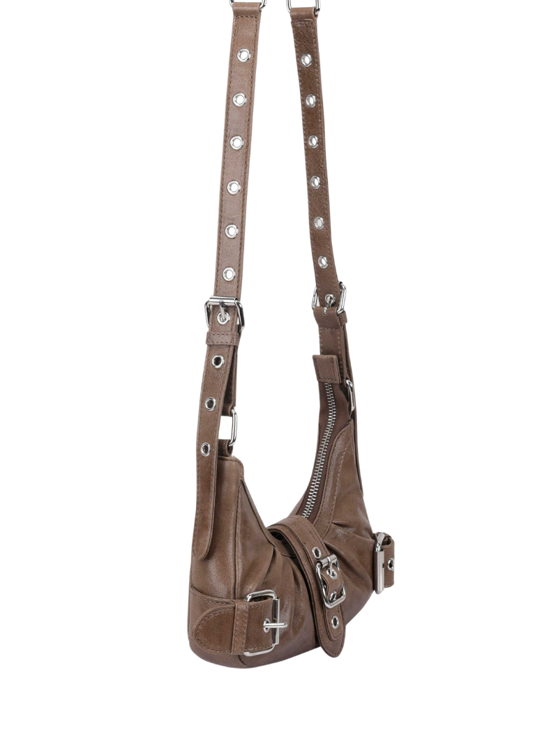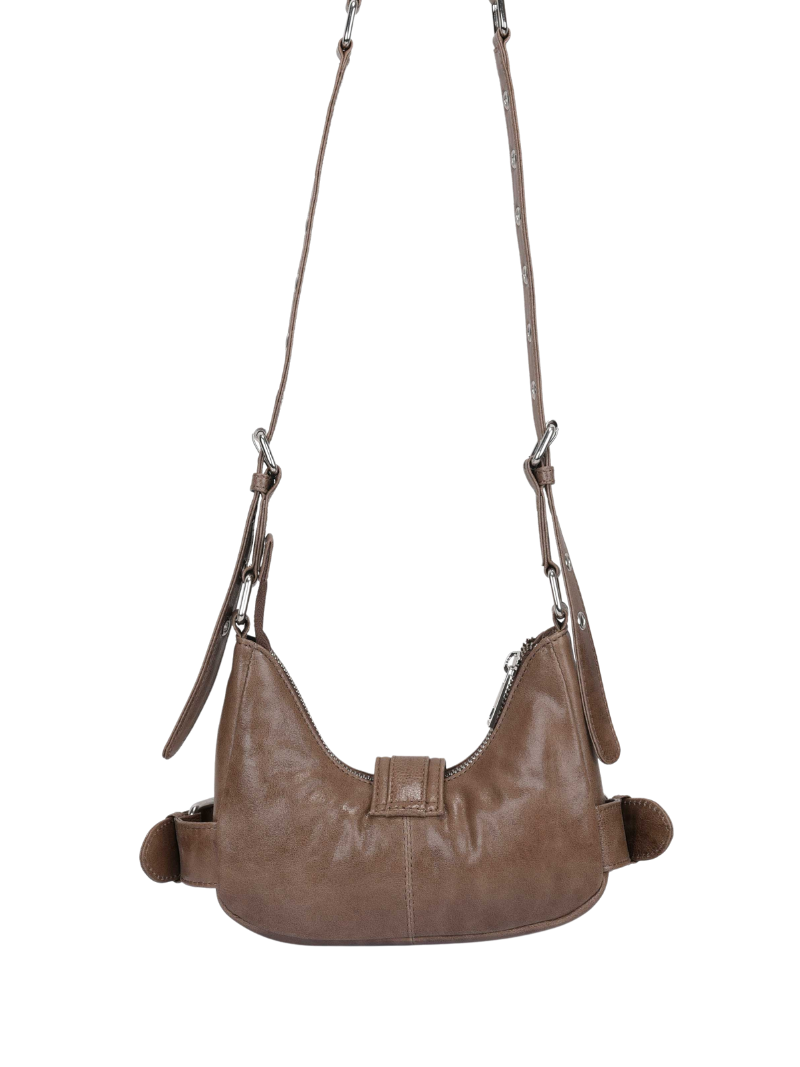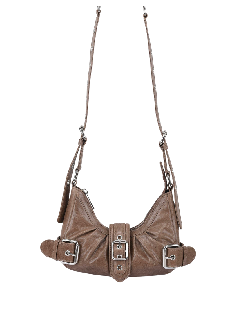 The Palma Village taupe bag from Núnoo is a bag with a bold design and details inspired by biker fashion. Its crinkle-effect finish and silver metal hardware give it a rebellious and sophisticated look. It features decorative buckles, structured pleats and an adjustable strap with eyelets, providing versatility and an avant-garde touch. Its compact yet functional size makes it ideal for carrying essentials in style, perfect for complementing urban and daring looks.