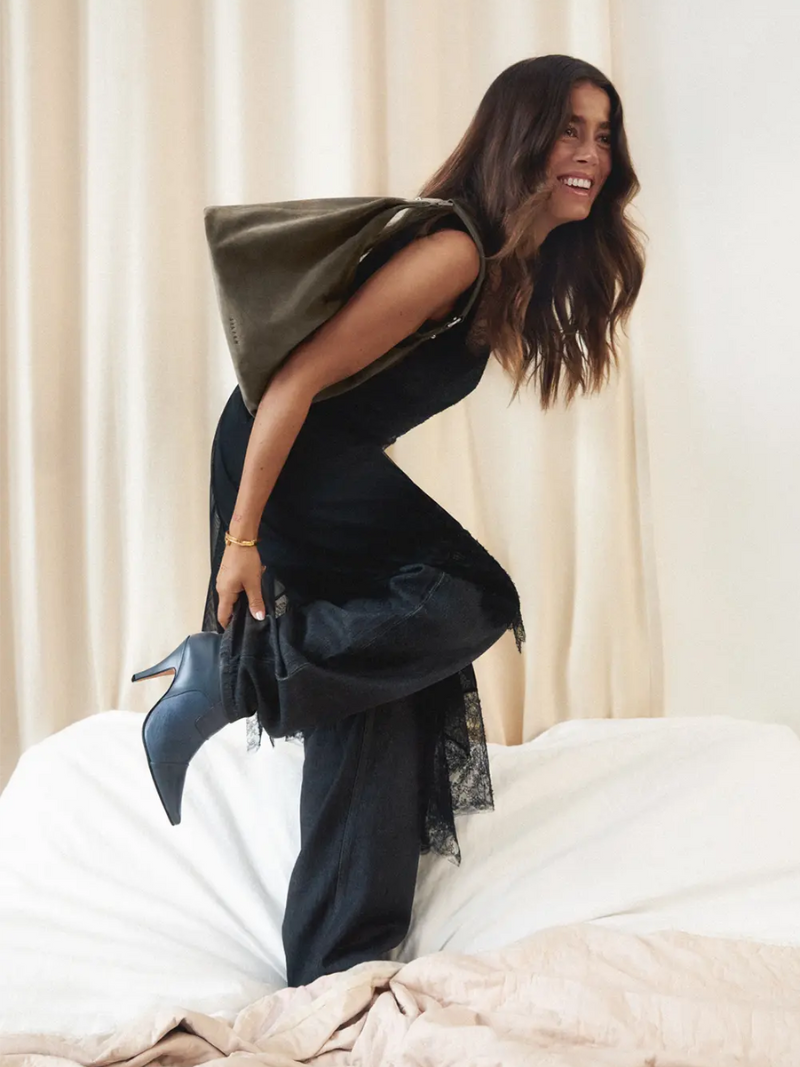 Shoulder bag from the Bruna Bear x SILFEN collection. Crafted from soft khaki suede, it features a spacious main compartment and an interior pocket for your essentials: mobile phone, keys, and small items.