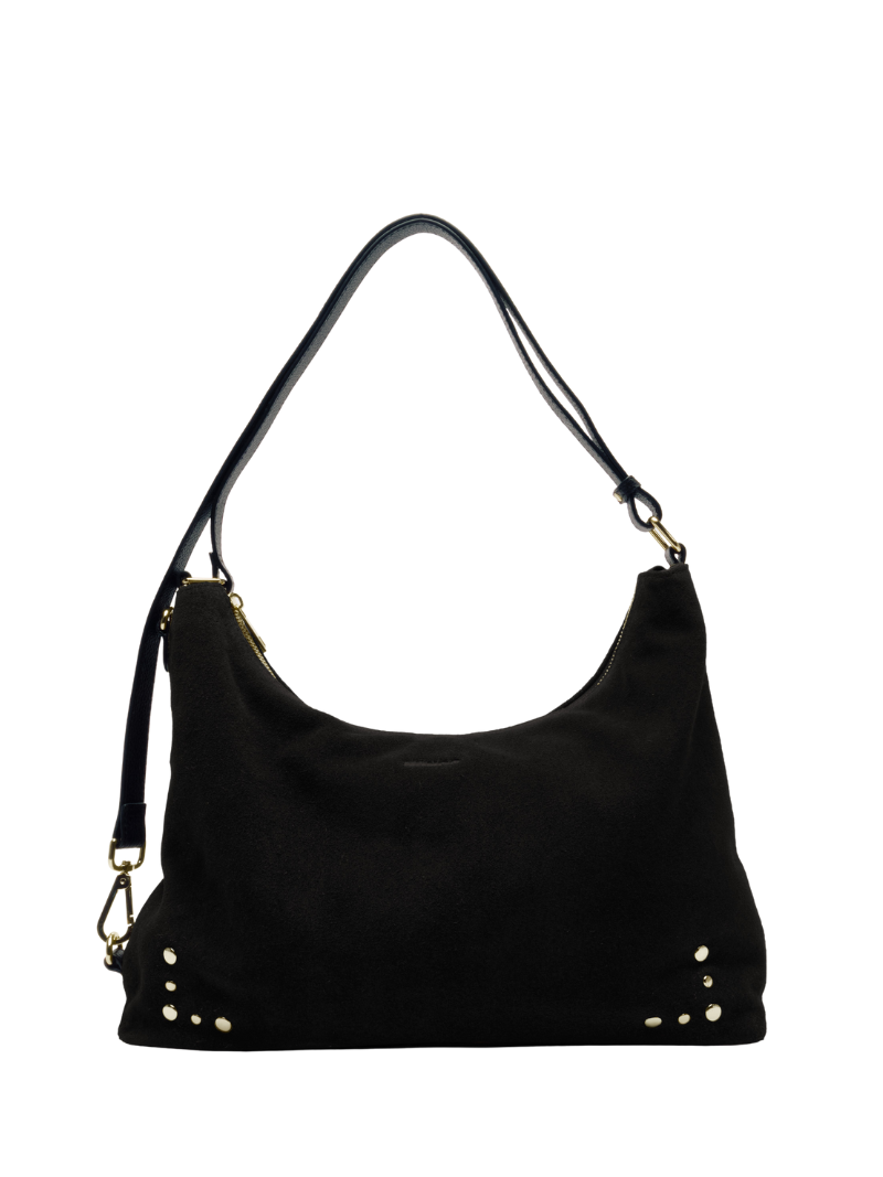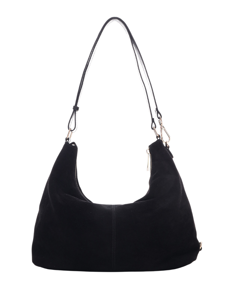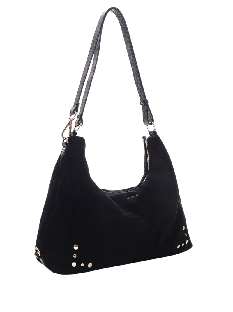 Shoulder bag made of soft black suede with gold details. The Rio model has a classic design with an elegant touch that makes it easy to style. It features a main compartment and a zipper closure to keep your belongings secure.