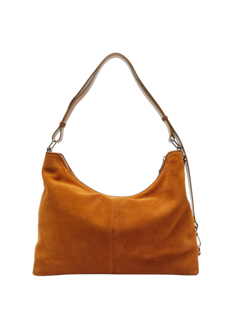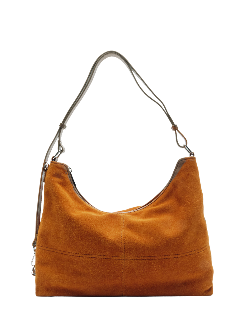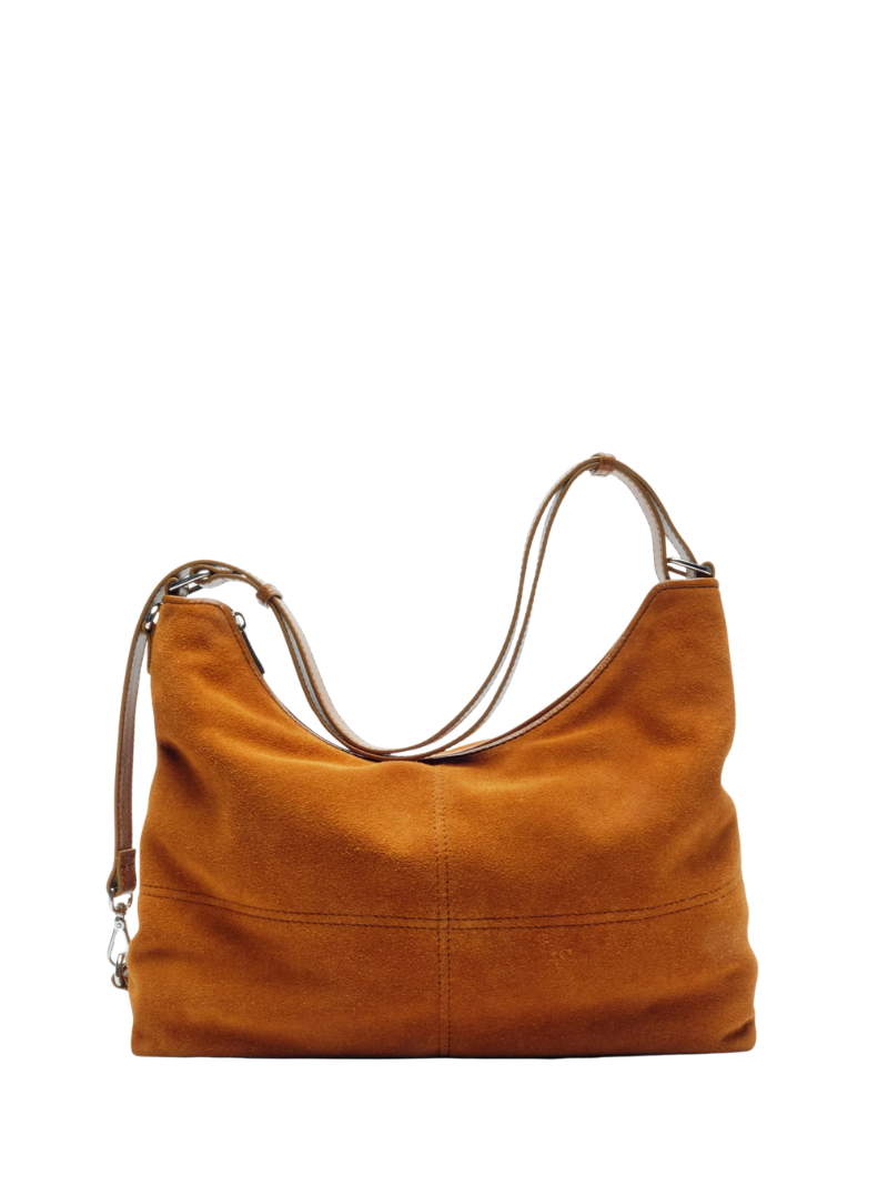 Shoulder bag made of soft brown suede. The Rio model has a classic design with an elegant touch that makes it easy to style. It features a main compartment and a zipper closure to keep your belongings secure.