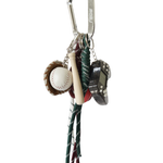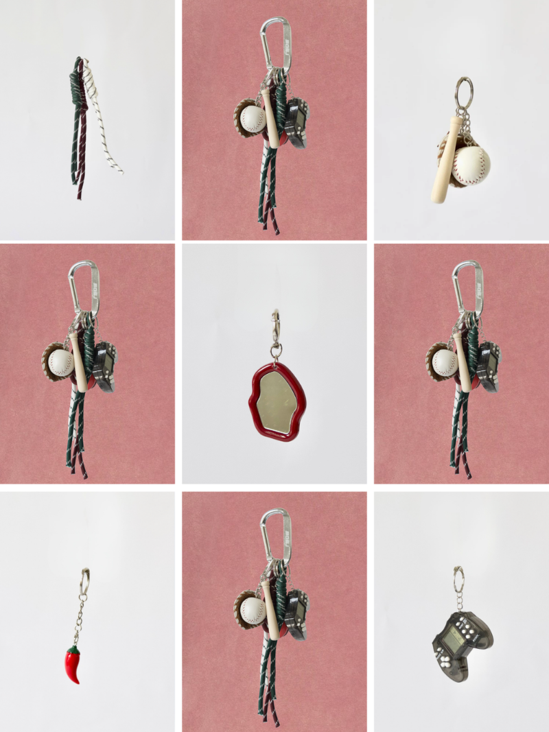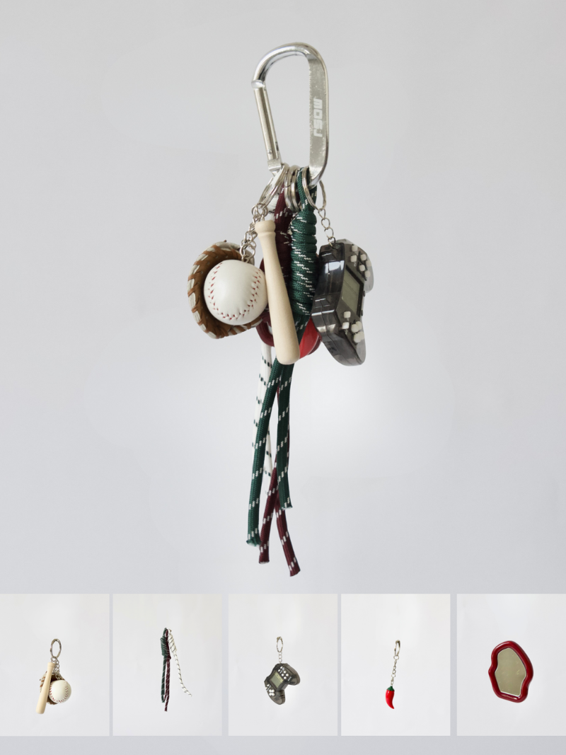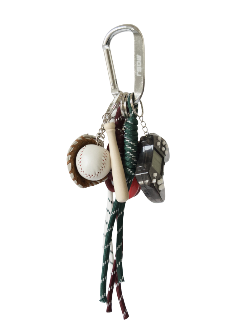The RIOJA charm combines the iconic MOSJ buckle with a mix of charms that play between the nostalgic and the unexpected: Baseball , Gameboy and Pepper , accompanied by three strings in white, brown and dark green tones that add character and contrast.