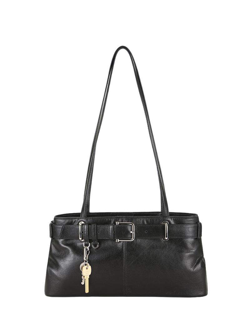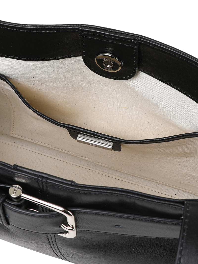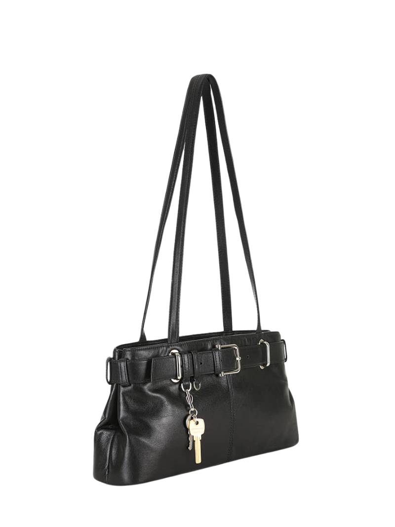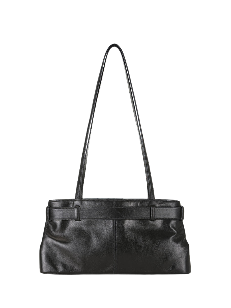 Stone black leather shoulder bag with an adjustable belt and metal buckle for a modern touch. Its spacious design and long handles guarantee comfort and style.
