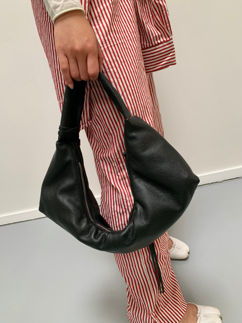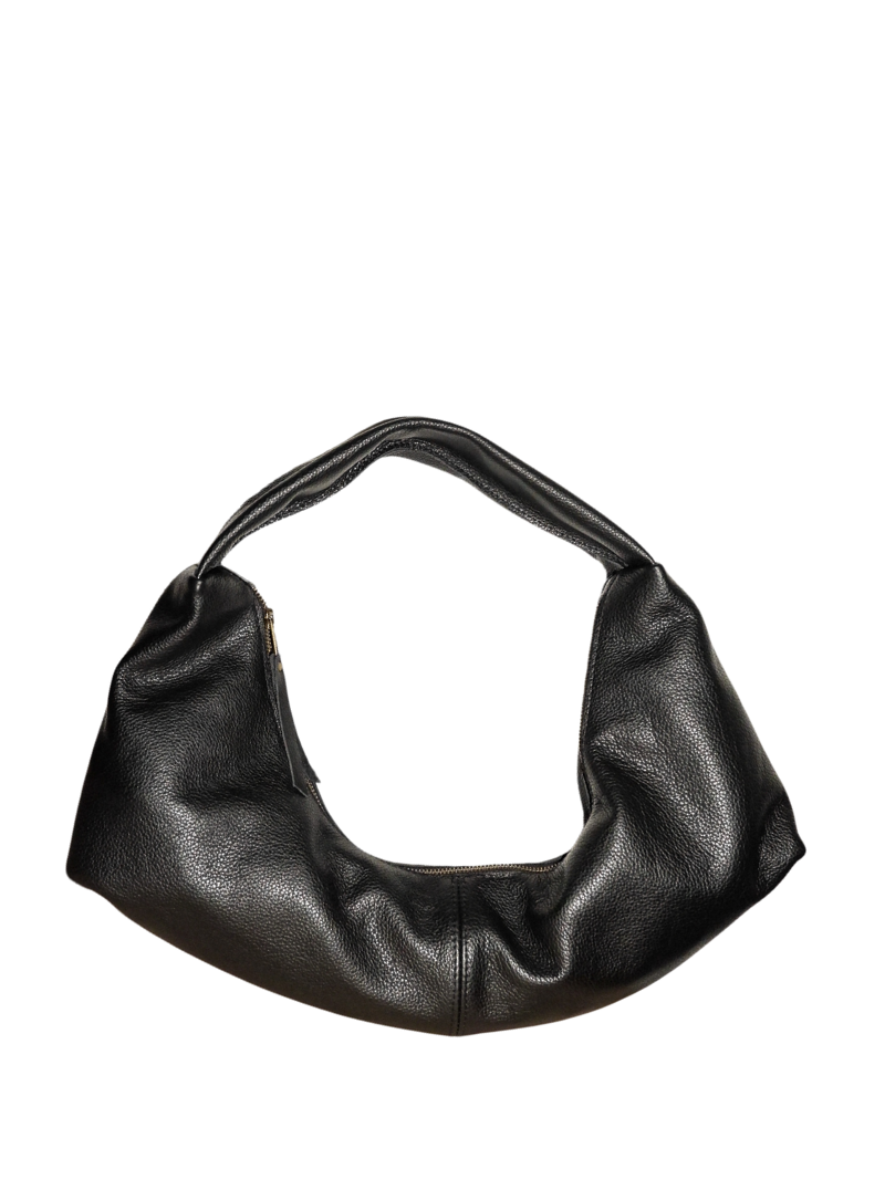 This stylish short bag closes with a large side-to-side zipper, complemented by a long leather pull. Its design includes a press stud on the handle for comfortable shoulder carrying.