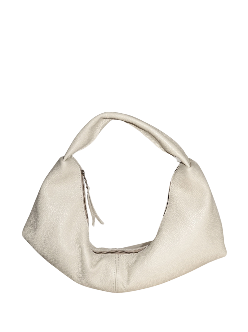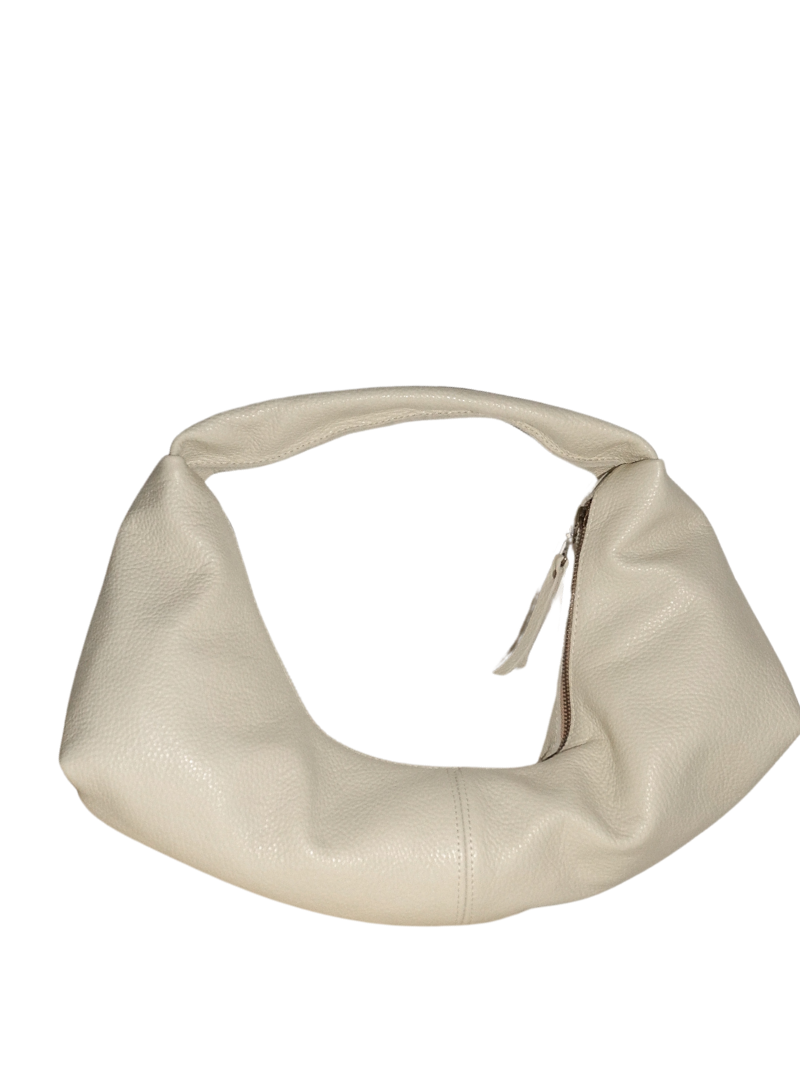 Cream-colored shoulder bag, made of leather with a wrinkled and shiny finish.