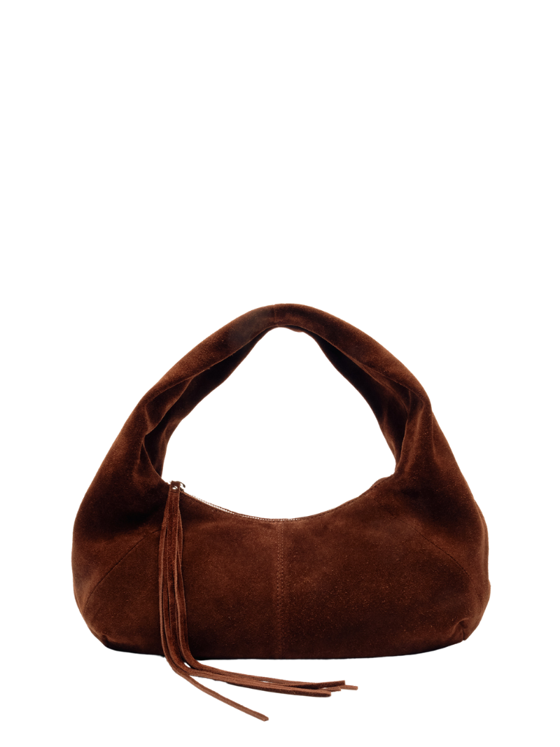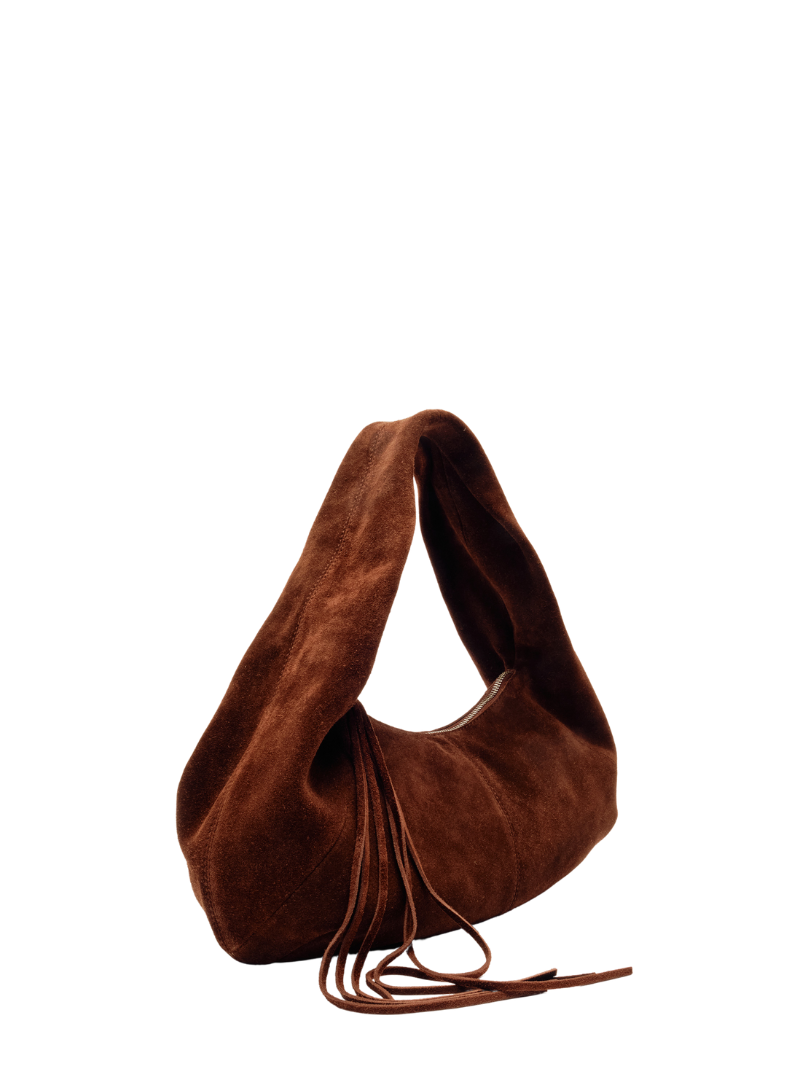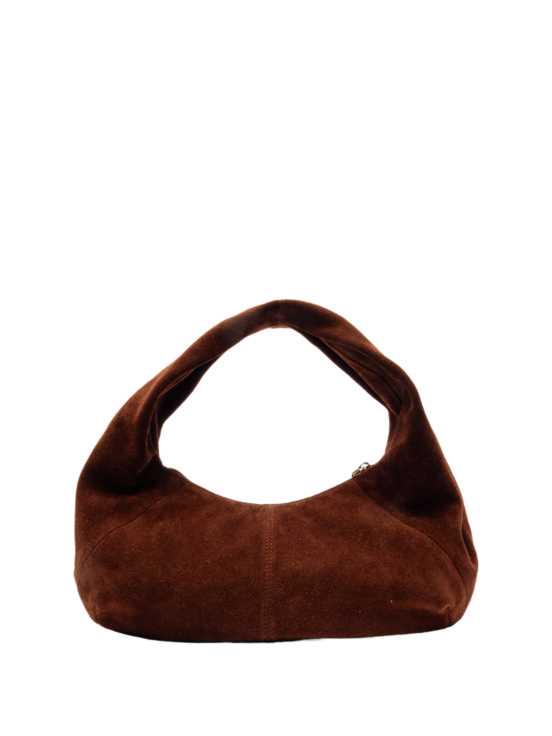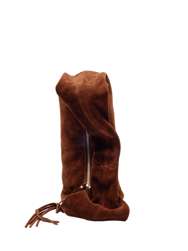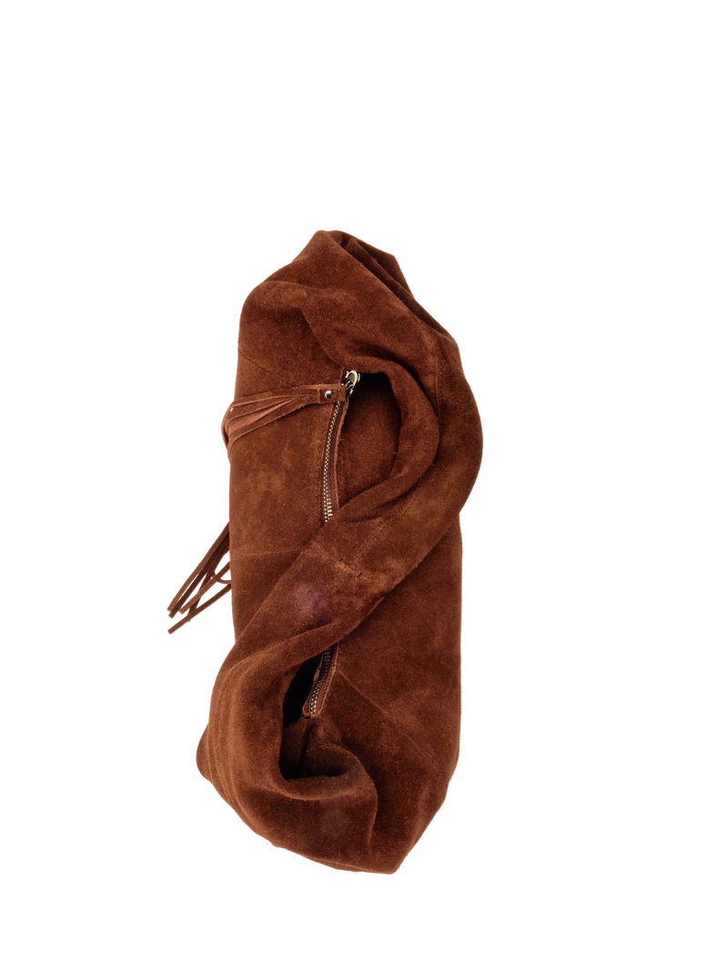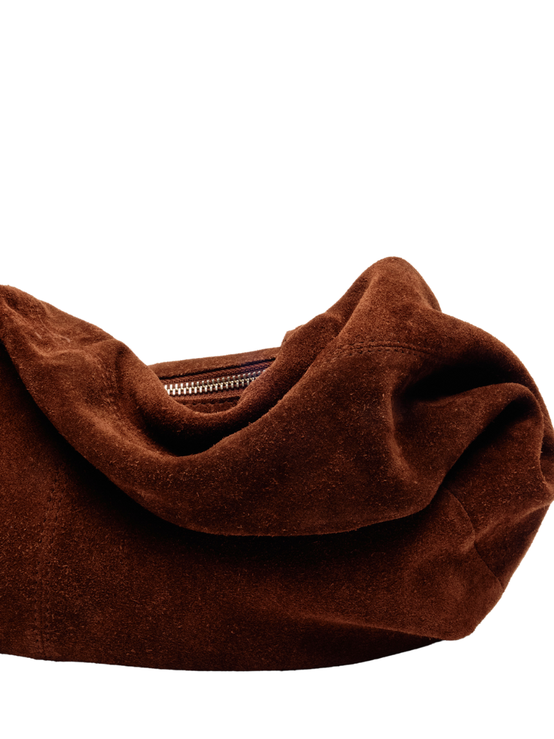Chocolate brown suede bag. The perfect companion for those seeking style and practicality. Its medium size makes it the ideal choice for carrying all your essentials: phone, wallet, sunglasses, eyeglasses, a compact umbrella, and even a small water bottle. Thanks to its soft, wraparound design, it adds a sophisticated and effortless touch to any everyday look.