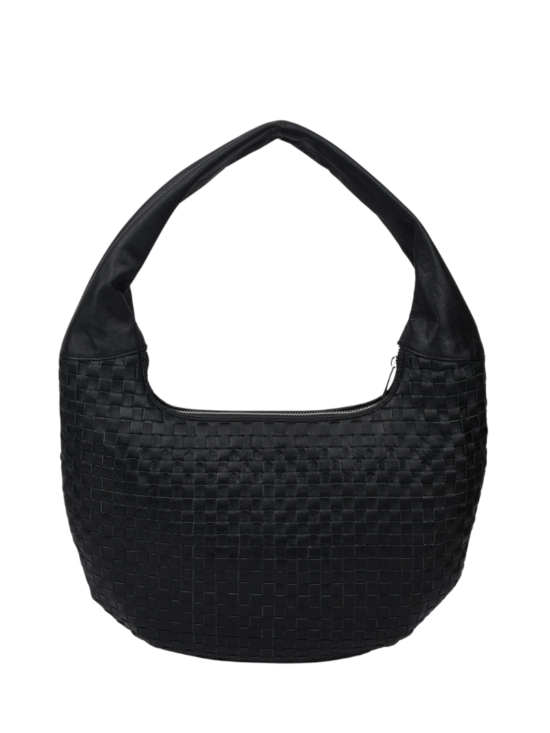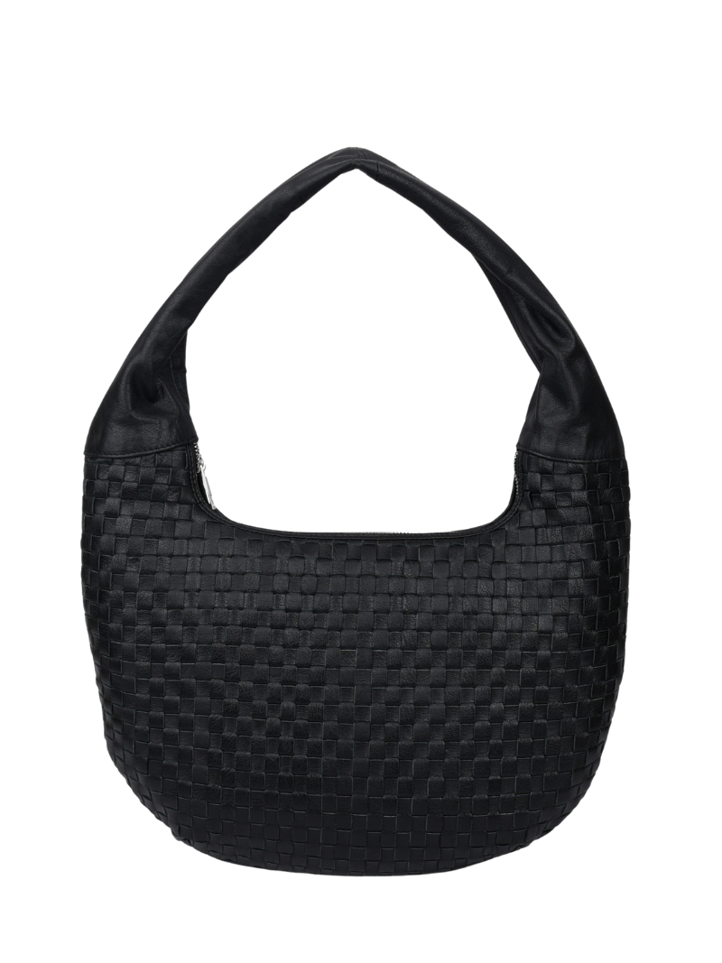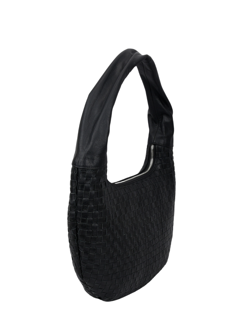 Black leather shoulder bag with a braided design. Its modern, curved silhouette makes it a versatile accessory, ideal for both everyday use and more special occasions.