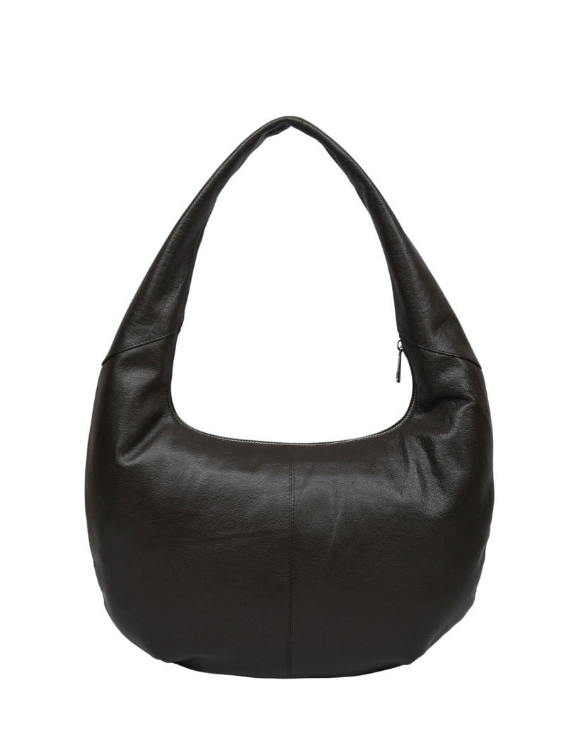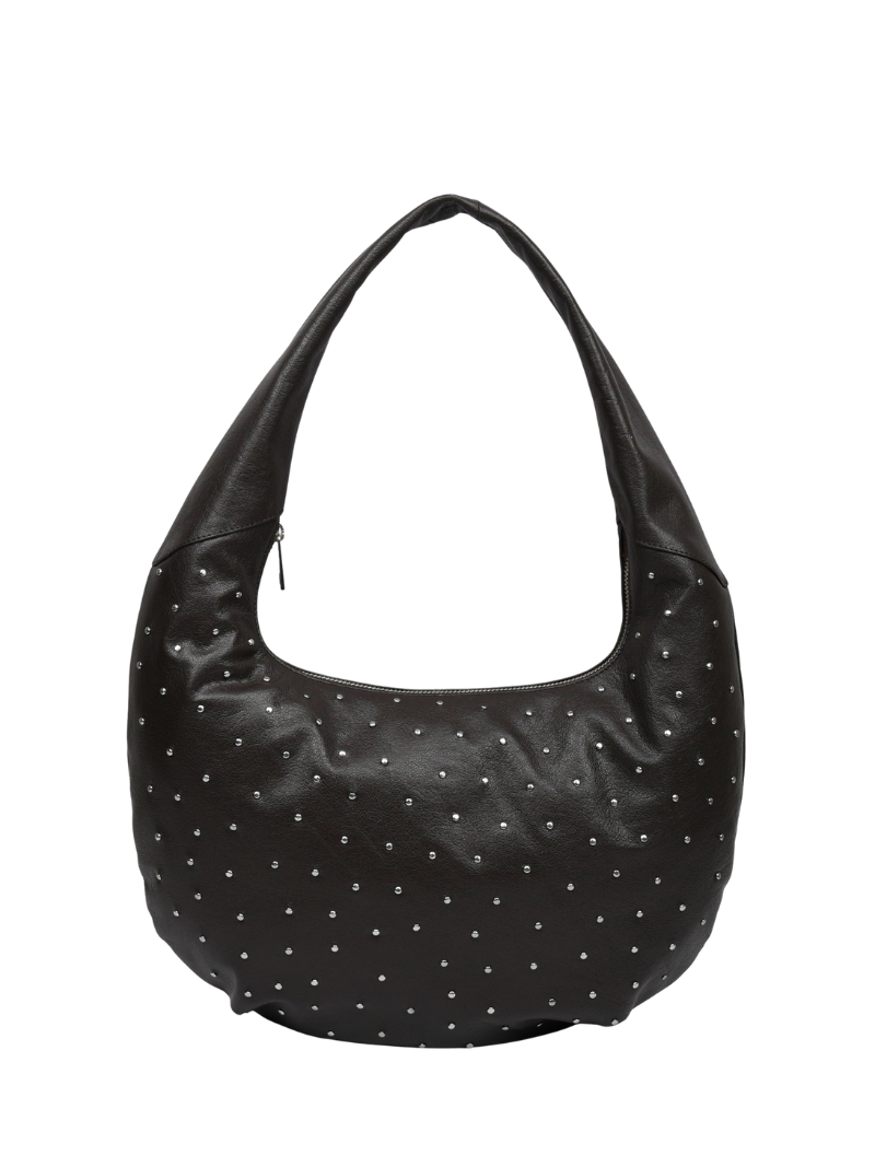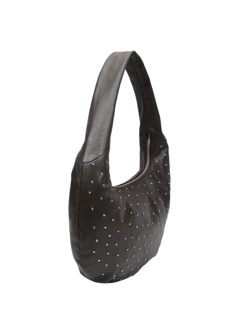 Bolso de hombro de piel en color marrón oscuro con detalle de tachuelas plateadas. Su silueta curvada y moderna lo convierte en un accesorio versátil, ideal tanto para el uso diario como para ocasiones más especiales.