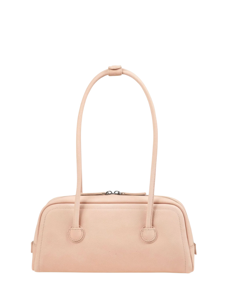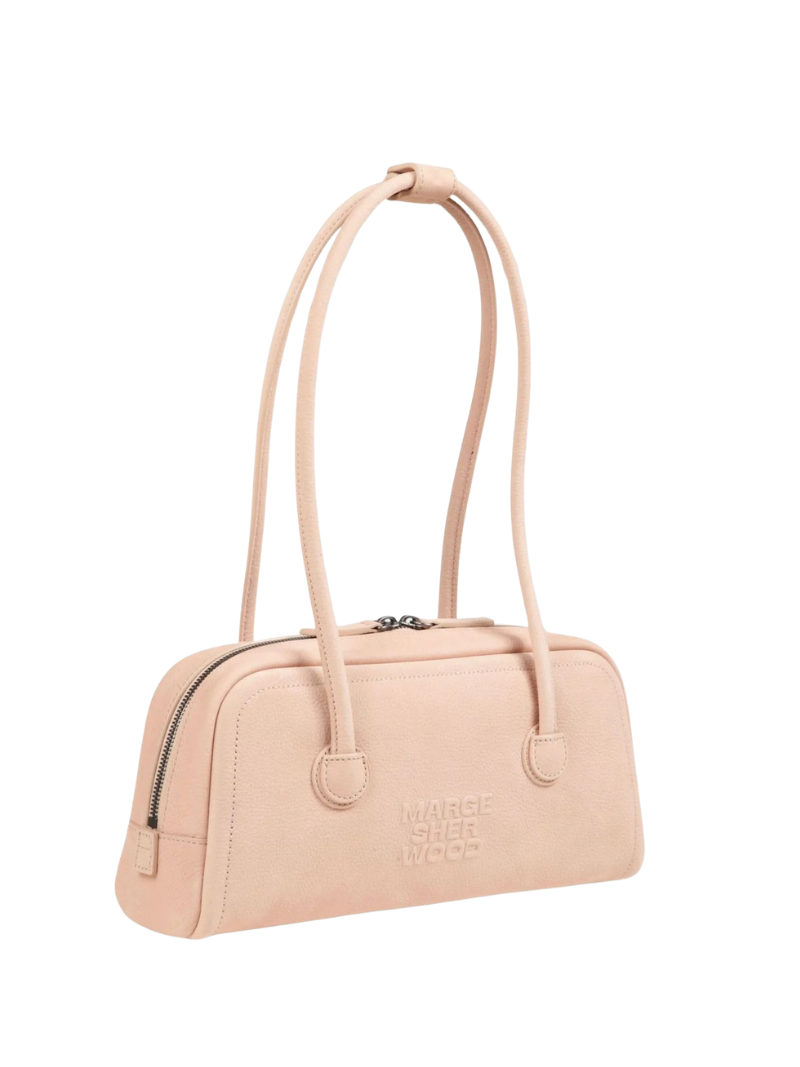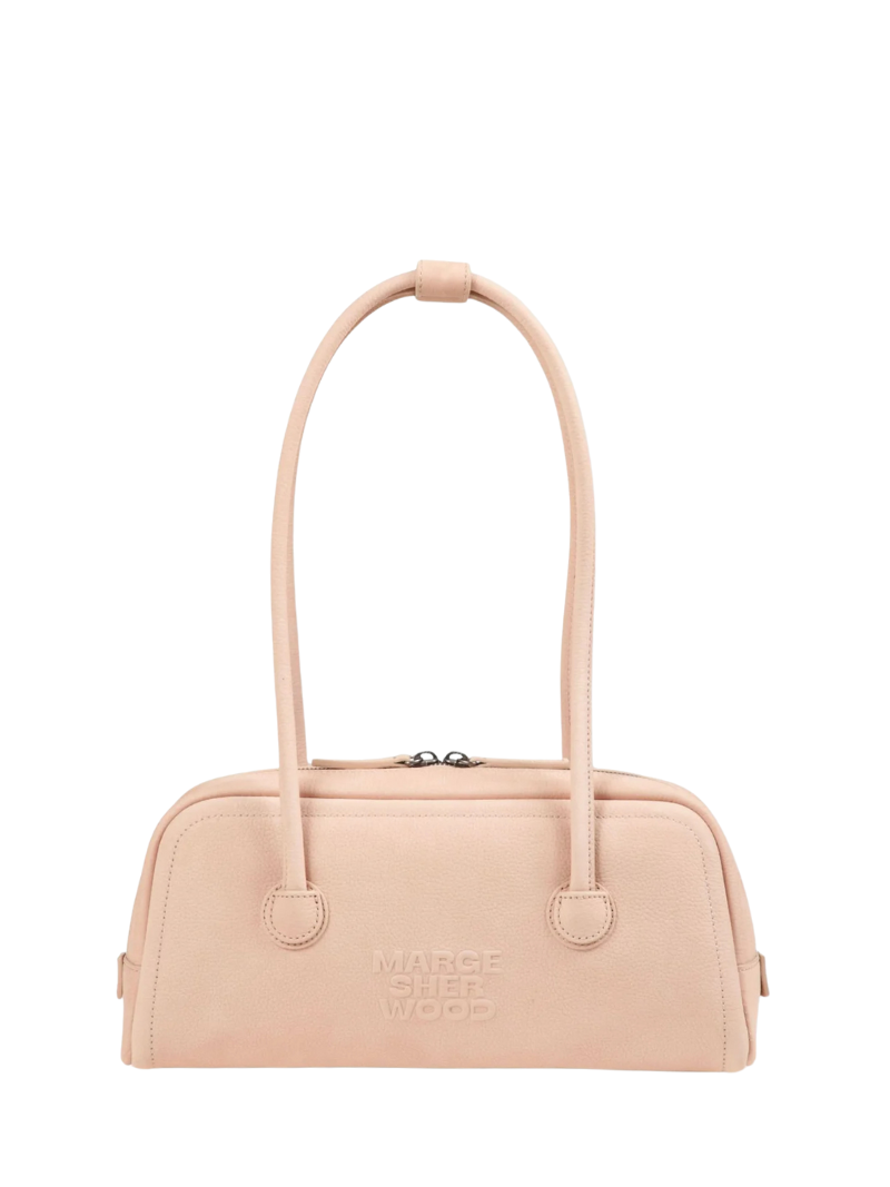 Beige leather shoulder bag with the brand logo embossed on the front and designed in a classic baguette shape. The bag features an interior pocket and a double-zip closure.