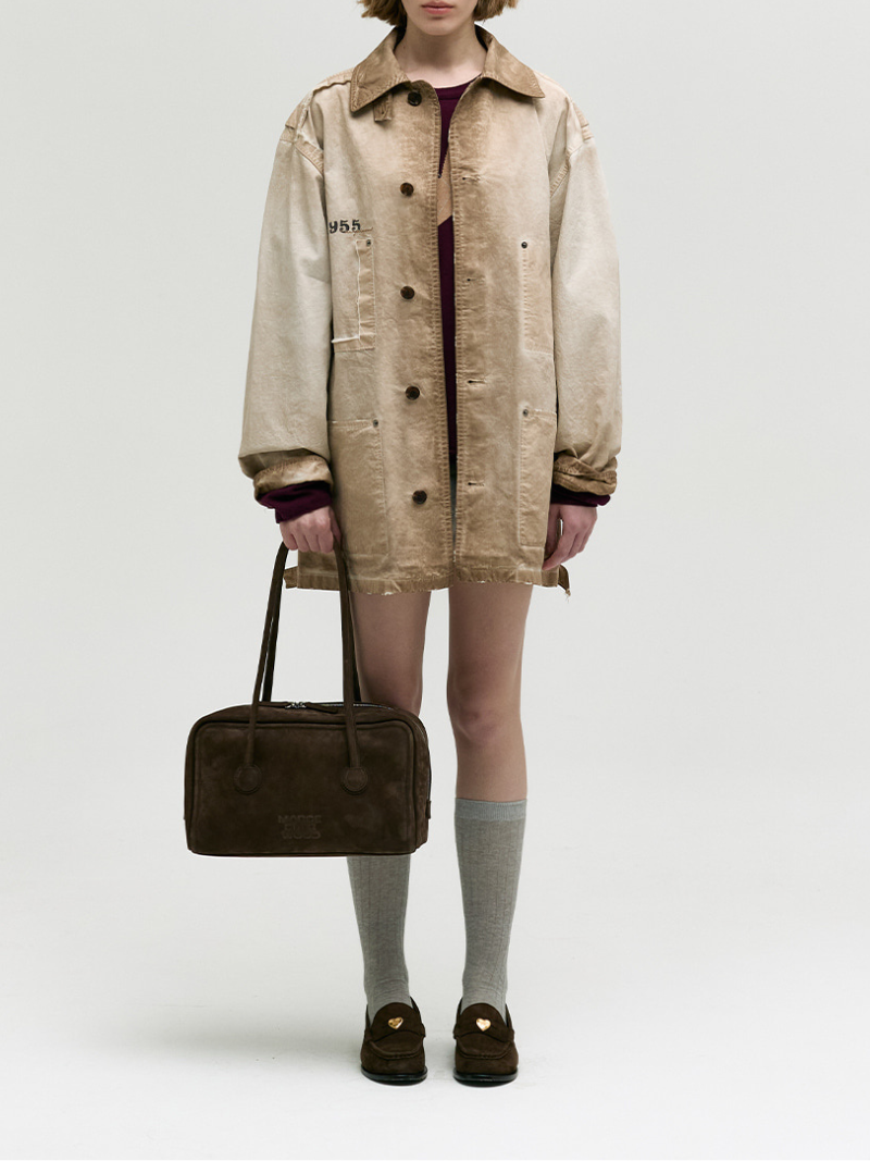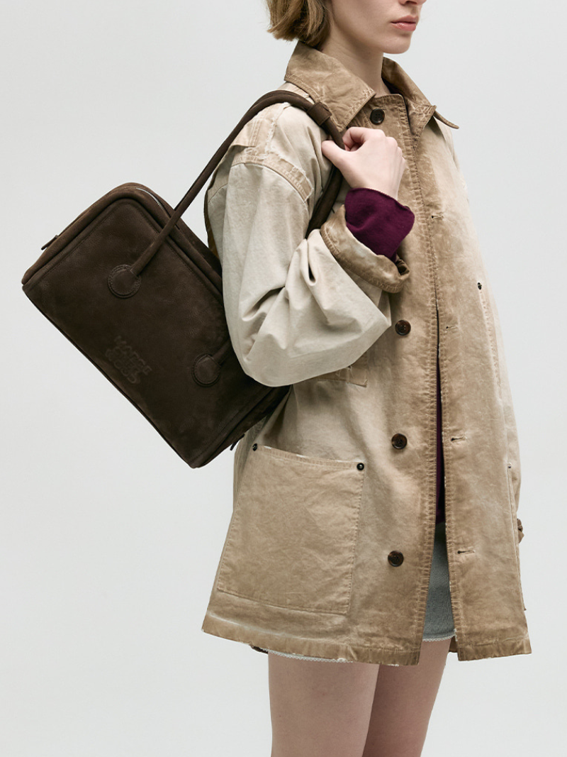 It has two leather handles for carrying it on the shoulder or by hand, and an elegant strap holder for more comfortable shoulder carrying. It features a double YKK zipper and an interior patch pocket.