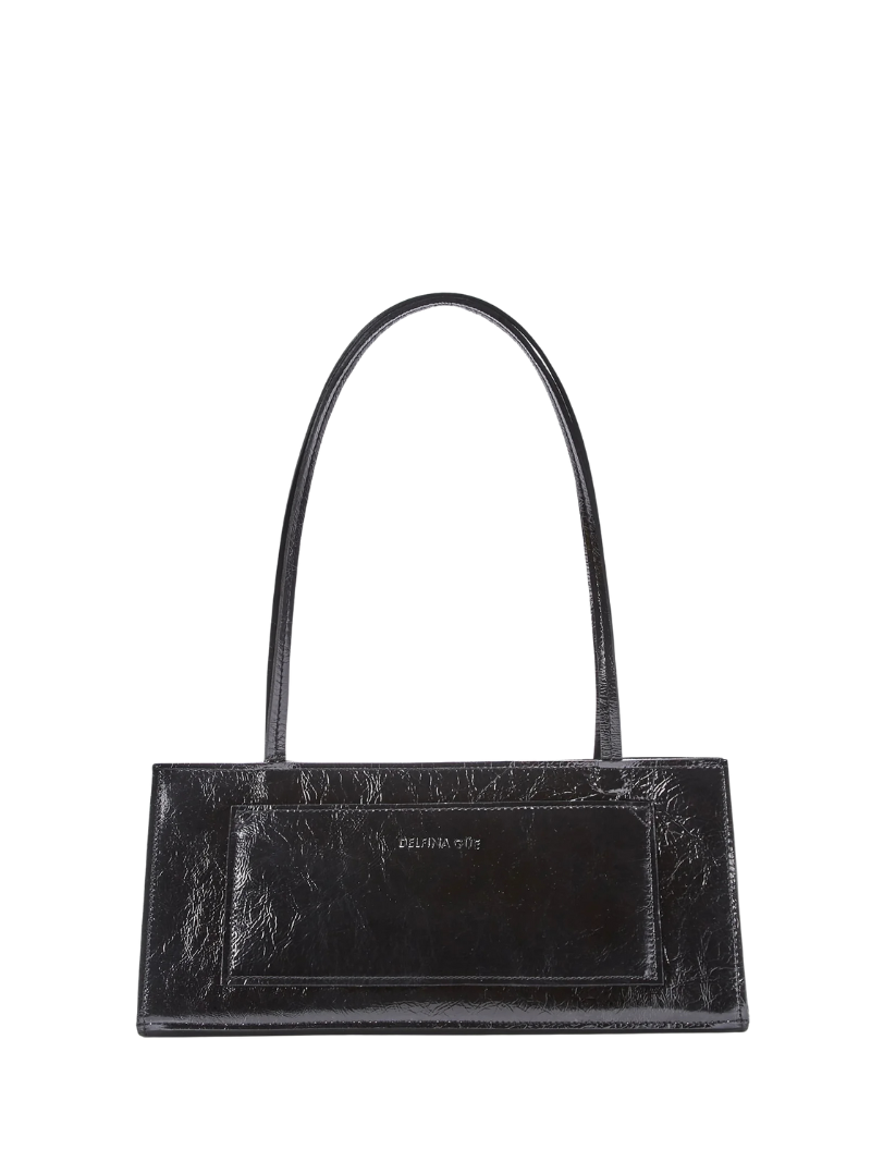 Small shoulder bag, baguette style, in black. The Hot dog model is made of leather with a wrinkled patent leather finish, which gives it a shiny appearance, but with great softness and luminosity.