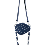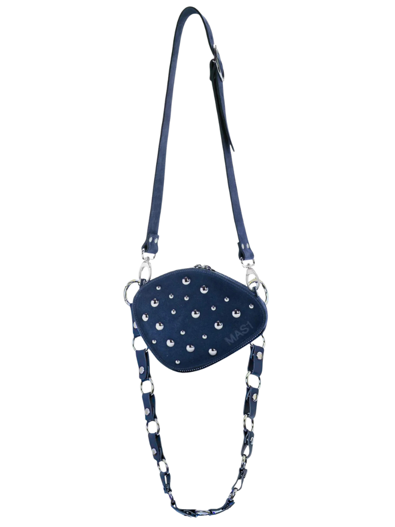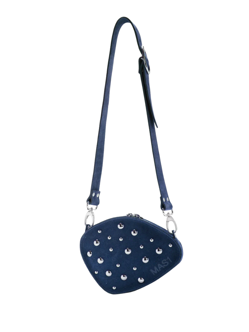 Blue oval-shaped suede crossbody bag with silver studs, LWG-certified cowhide, logo print on the front, and a handle for shoulder or crossbody wear. The handle is adjustable and interchangeable.