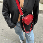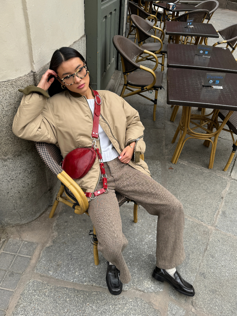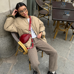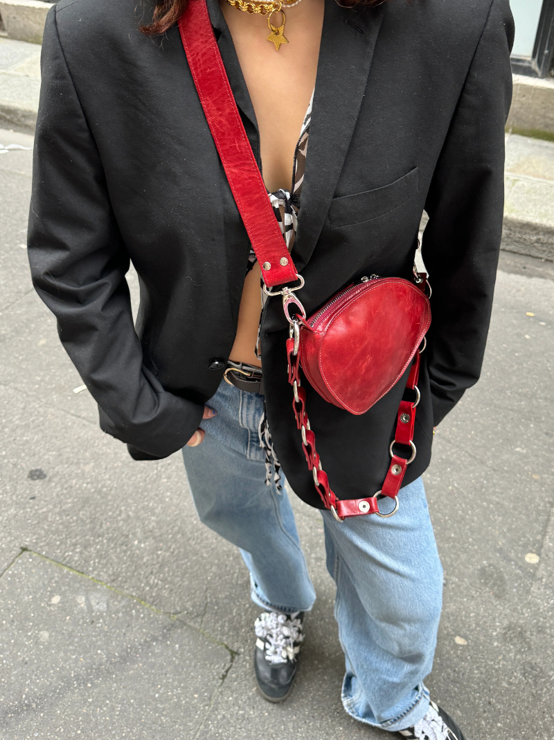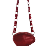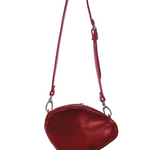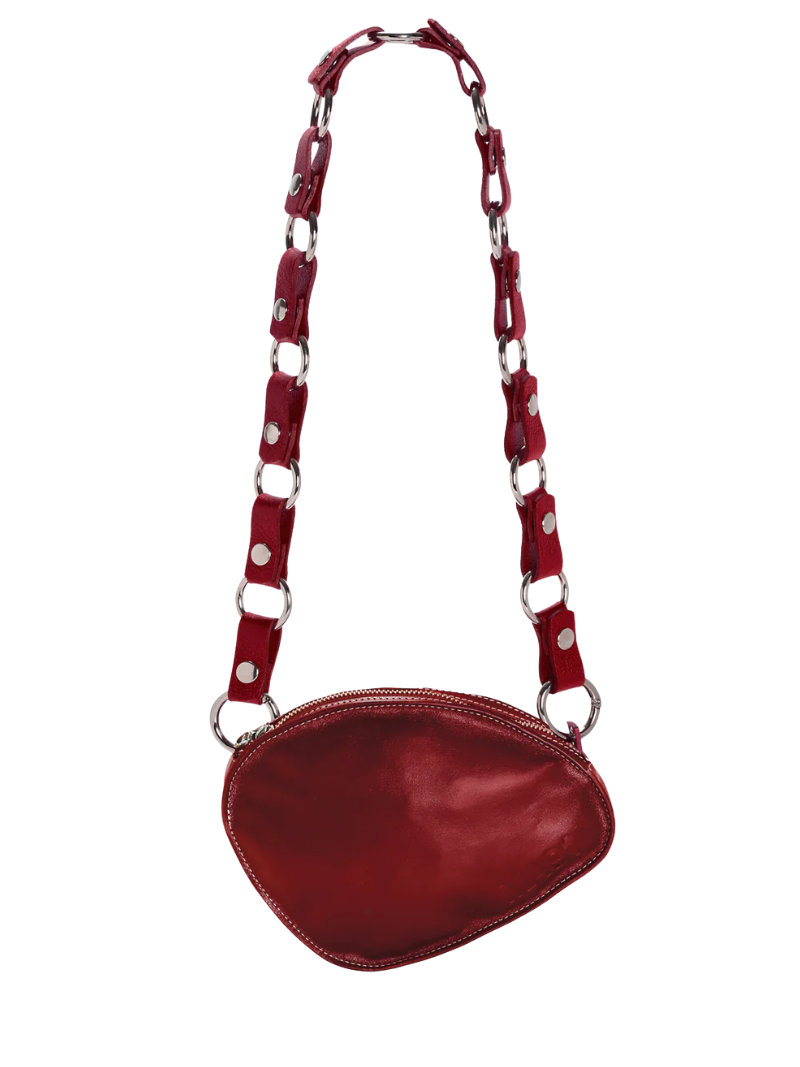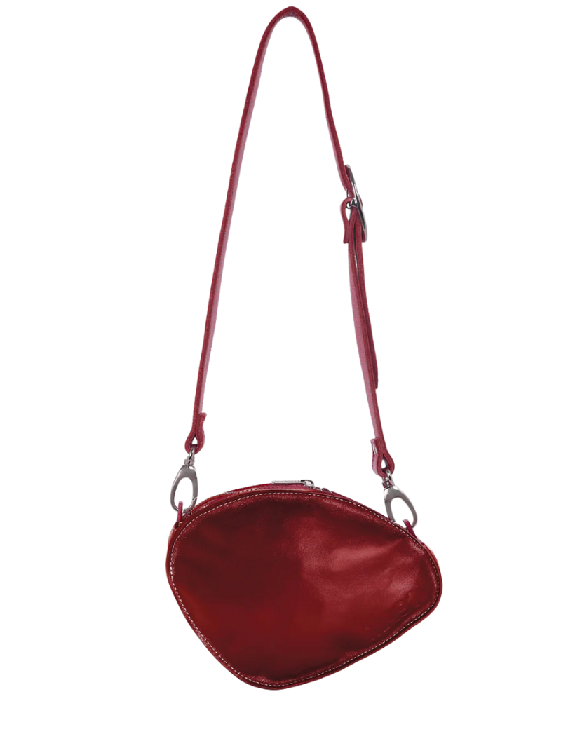 Oval-shaped maroon shoulder bag, made of “LWG-certified” cowhide, logo print on the front, with a handle to carry it on one shoulder or across the body. The handle is adjustable and interchangeable.