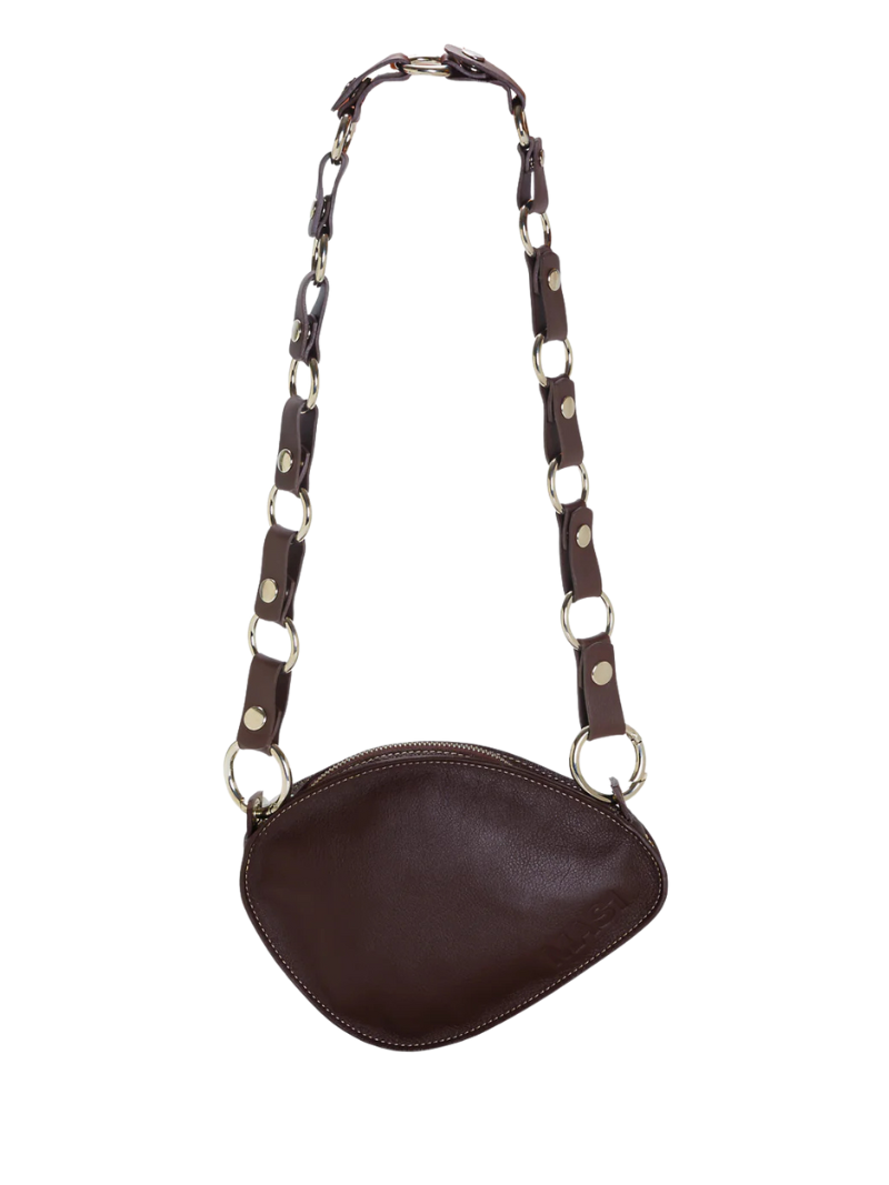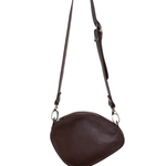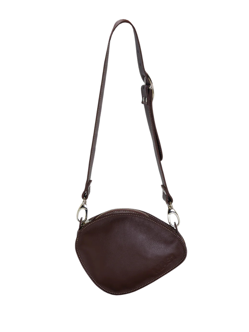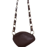 Brown oval-shaped shoulder bag, LWG-certified cowhide, logo print on the front, with a handle for shoulder or crossbody wear. The handle is adjustable and interchangeable.