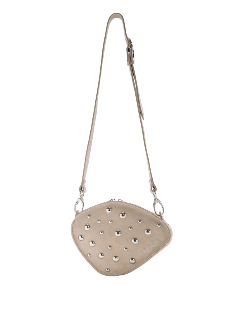 Small, earth-toned, oval-shaped suede bag with a shoulder strap, silver studs, LWG-certified suede, logo print on the front, and an adjustable strap for crossbody wear. Studded on the main side of the bag.