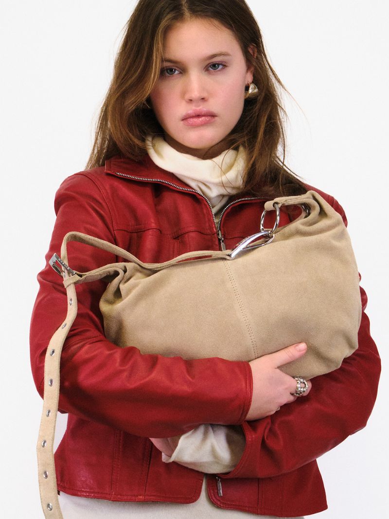 Medium-sized beige suede crossbody bag, ideal for everyday use. Its soft, lightweight design fits comfortably against the body, while the adjustable strap allows you to wear it over your shoulder or across your body.