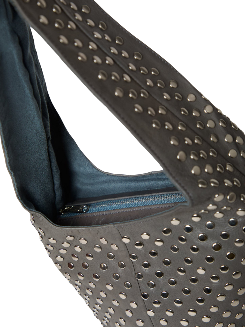 Bolso pequeño de tachuelas de piel de color gris. El accesorio ideal para quienes buscan estilo y funcionalidad. Fabricado en piel de alta calidad, este bolso destaca por su color blanco vibrante, complementado con tachuelas metálicas plateadas que le otorgan un toque edgy y sofisticado. Su diseño compacto lo convierte en el acompañante perfecto para llevar lo esencial en cualquier salida, añadiendo un toque audaz y moderno a cualquier look. Eleva tu outfit con este bolso de diseño atrevido y detalles únicos.