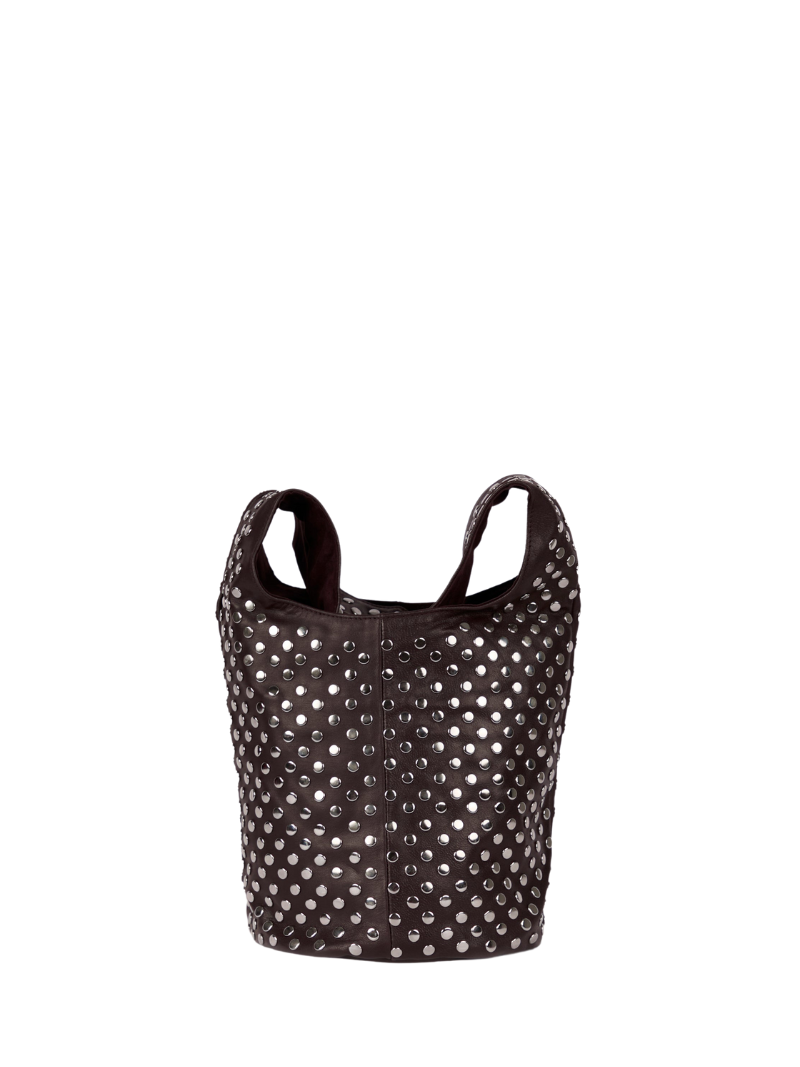 El bolso Airlie marrón pequeño de hombro es el accesorio ideal para quienes buscan estilo y funcionalidad. Fabricado en piel de alta calidad, este bolso destaca por su color marrón complementado con tachuelas metálicas plateadas que le otorgan un toque edgy y sofisticado. Su diseño compacto lo convierte en el acompañante perfecto para llevar lo esencial en cualquier salida, añadiendo un toque audaz y moderno a cualquier look. Eleva tu outfit con este bolso de diseño atrevido y detalles únicos.