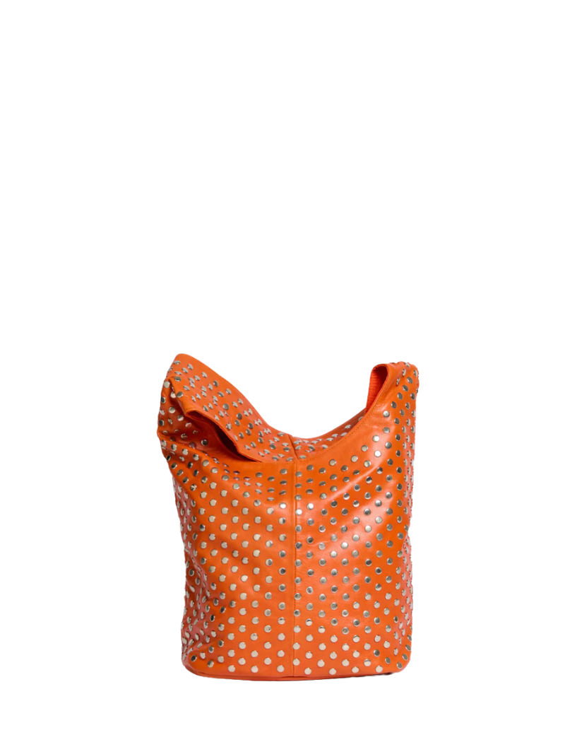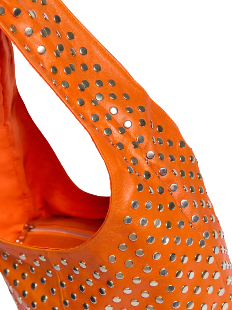 El bolso Airlie naranja pequeño es el accesorio ideal para quienes buscan estilo y funcionalidad. Fabricado en piel de alta calidad, este bolso destaca por su color blanco vibrante, complementado con tachuelas metálicas plateadas que le otorgan un toque edgy y sofisticado. Su diseño compacto lo convierte en el acompañante perfecto para llevar lo esencial en cualquier salida, añadiendo un toque audaz y moderno a cualquier look. Eleva tu outfit con este bolso de diseño atrevido y detalles únicos.