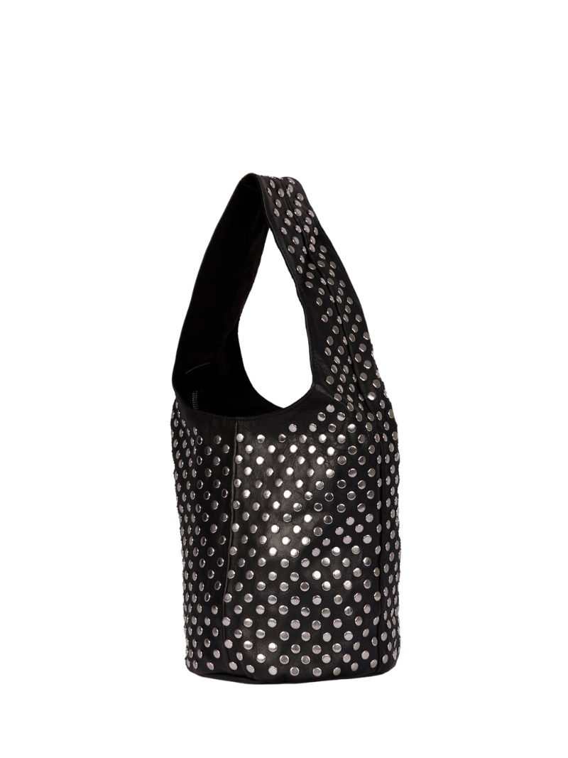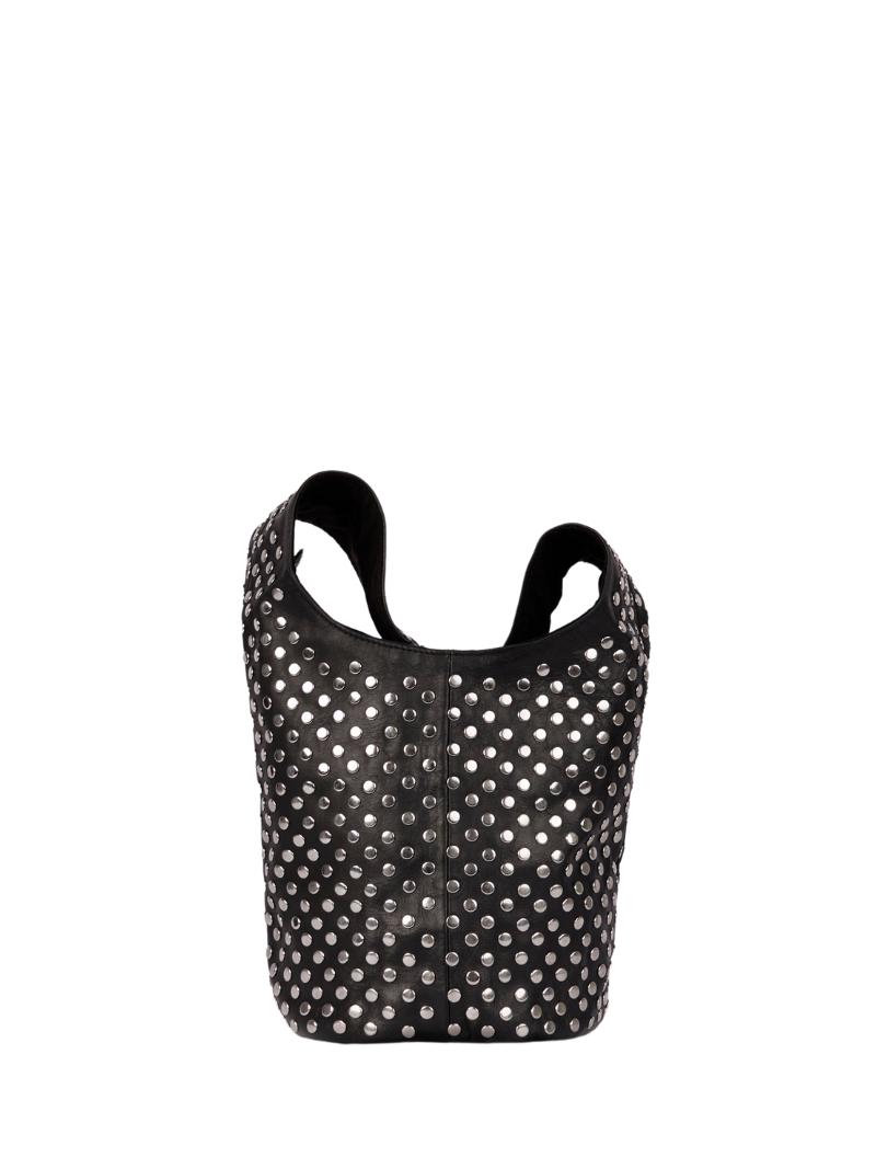 El bolso Airlie negro pequeño de hombro es el accesorio ideal para quienes buscan estilo y funcionalidad. Fabricado en piel de alta calidad, este bolso destaca por su color negro complementado con tachuelas metálicas plateadas que le otorgan un toque edgy y sofisticado. Su diseño compacto lo convierte en el acompañante perfecto para llevar lo esencial en cualquier salida, añadiendo un toque audaz y moderno a cualquier look. Eleva tu outfit con este bolso de diseño atrevido y detalles únicos.
