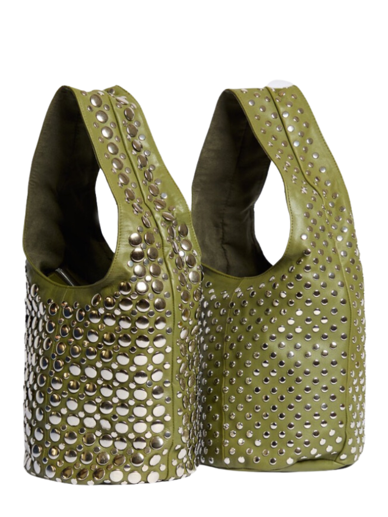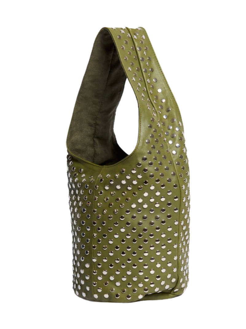 El bolso Airlie verde oliva grande es el accesorio ideal para quienes buscan estilo y funcionalidad. Fabricado en piel de alta calidad, este bolso destaca por su color blanco vibrante, complementado con tachuelas metálicas plateadas que le otorgan un toque edgy y sofisticado. Su diseño compacto lo convierte en el acompañante perfecto para llevar lo esencial en cualquier salida, añadiendo un toque audaz y moderno a cualquier look. Eleva tu outfit con este bolso de diseño atrevido y detalles únicos.