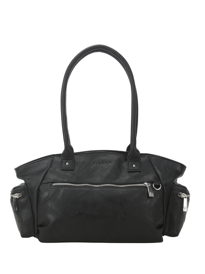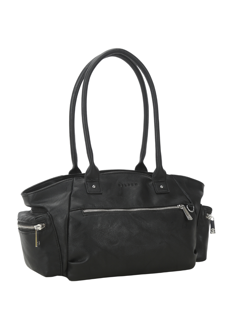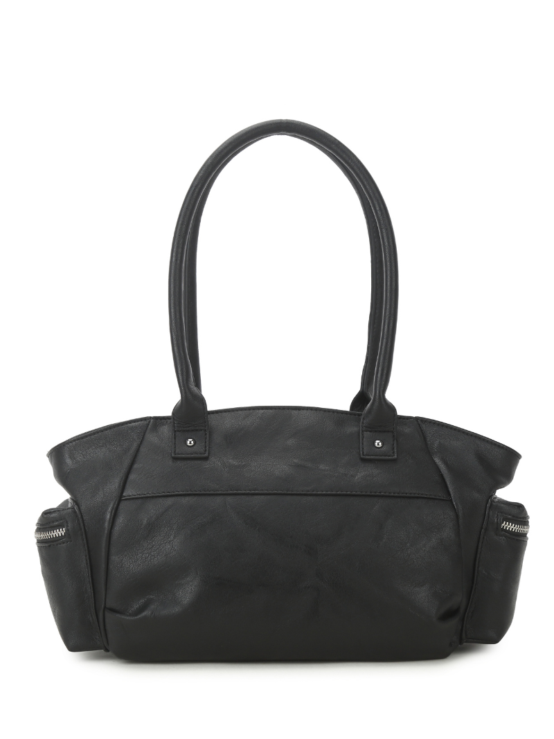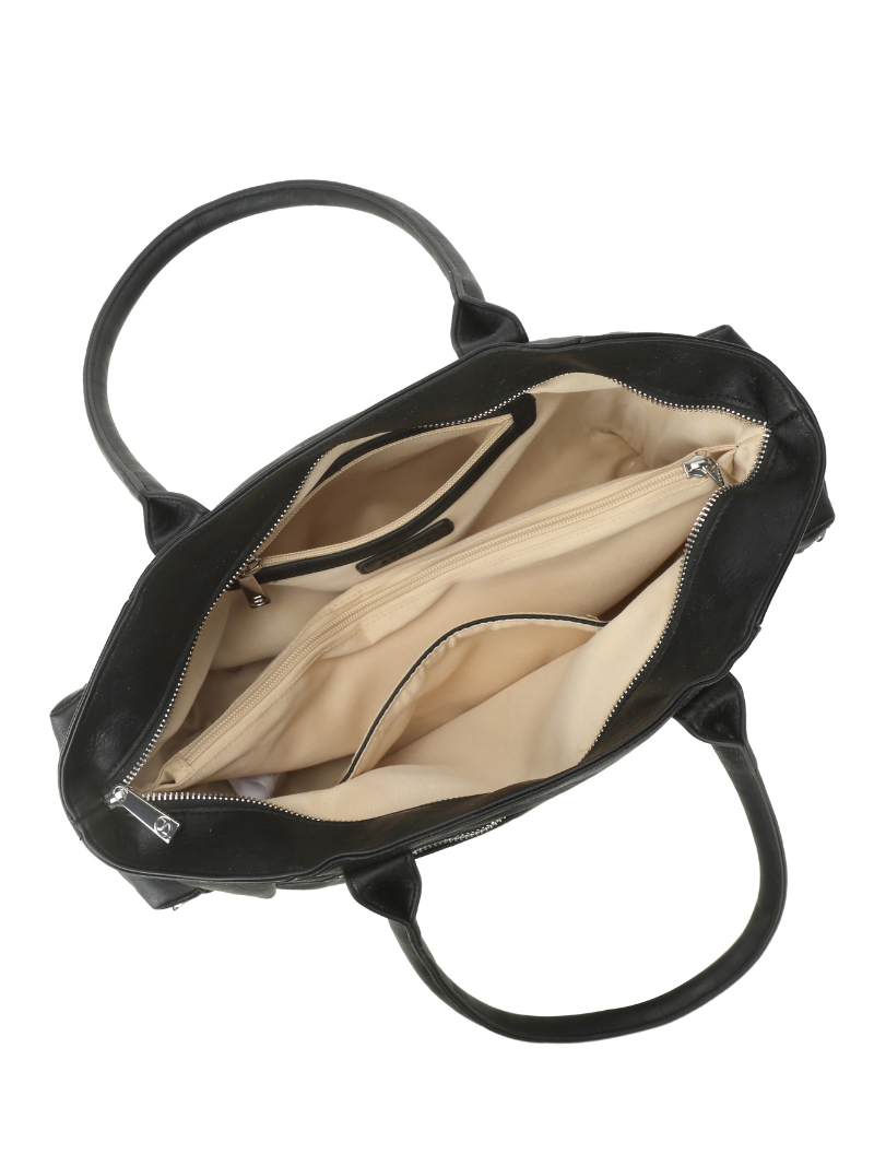 Bolso mediano en color negro espacioso y práctico. Un bolso para acompañarte en el trabajo, en clase o en tu día a día. Está hecho en un material suave tipo piel y cuenta con asas largas y cómodas para llevarlo al hombro.