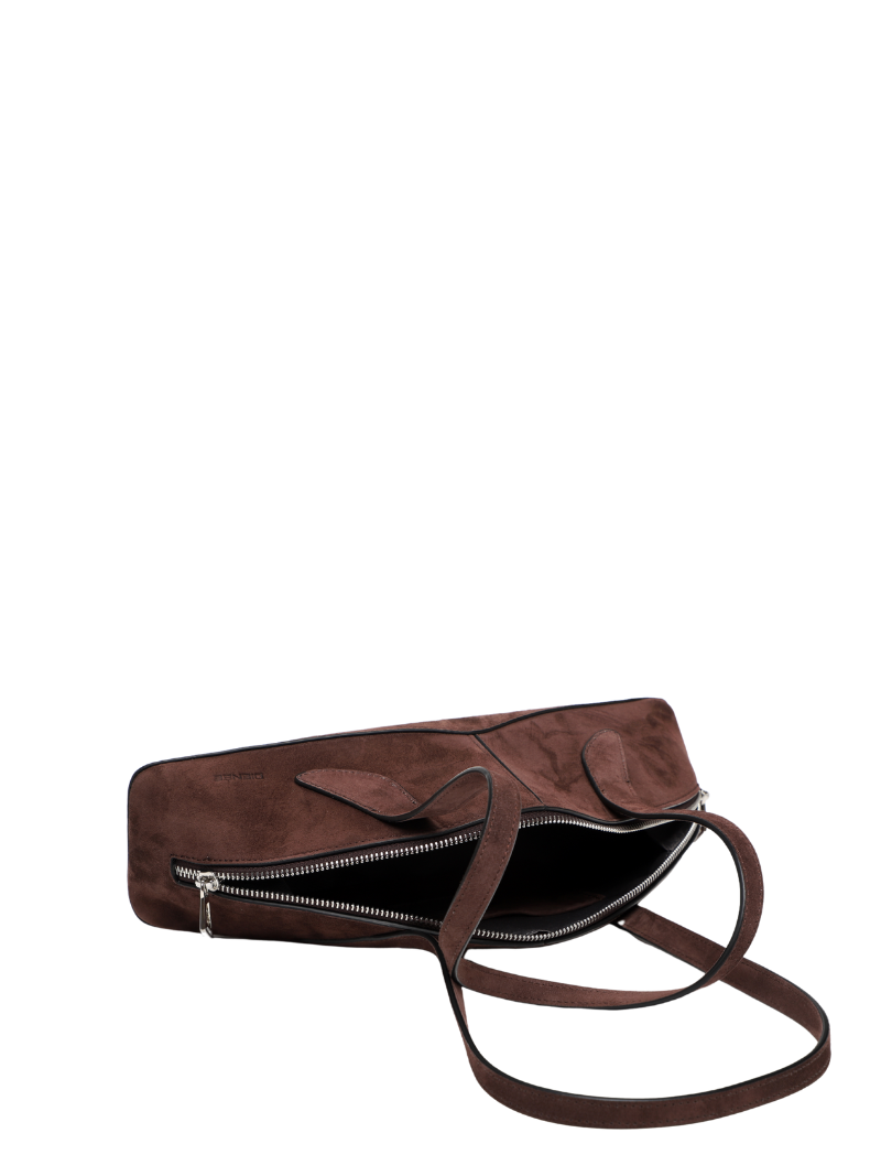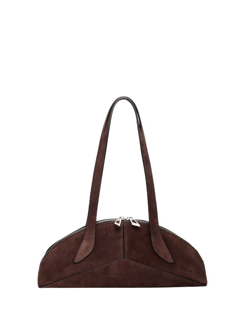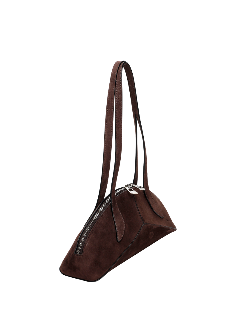 El bolso Arco de ante marrón chocolate es una pieza de diseño contemporáneo elaborada en piel auténtica con la textura suave característica del ante, que aporta un toque elegante a cualquier look. Su silueta curvada y estructurada, inspirada en líneas arquitectónicas, lo convierte en un accesorio único y llamativo.