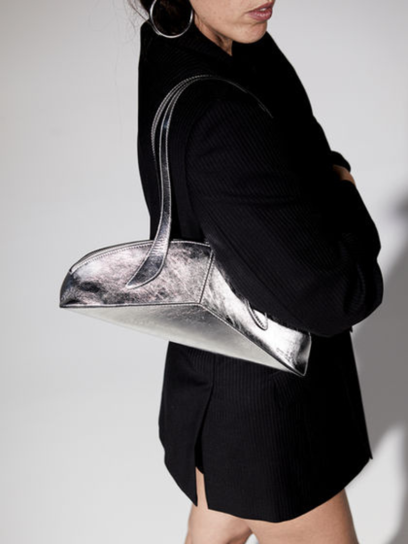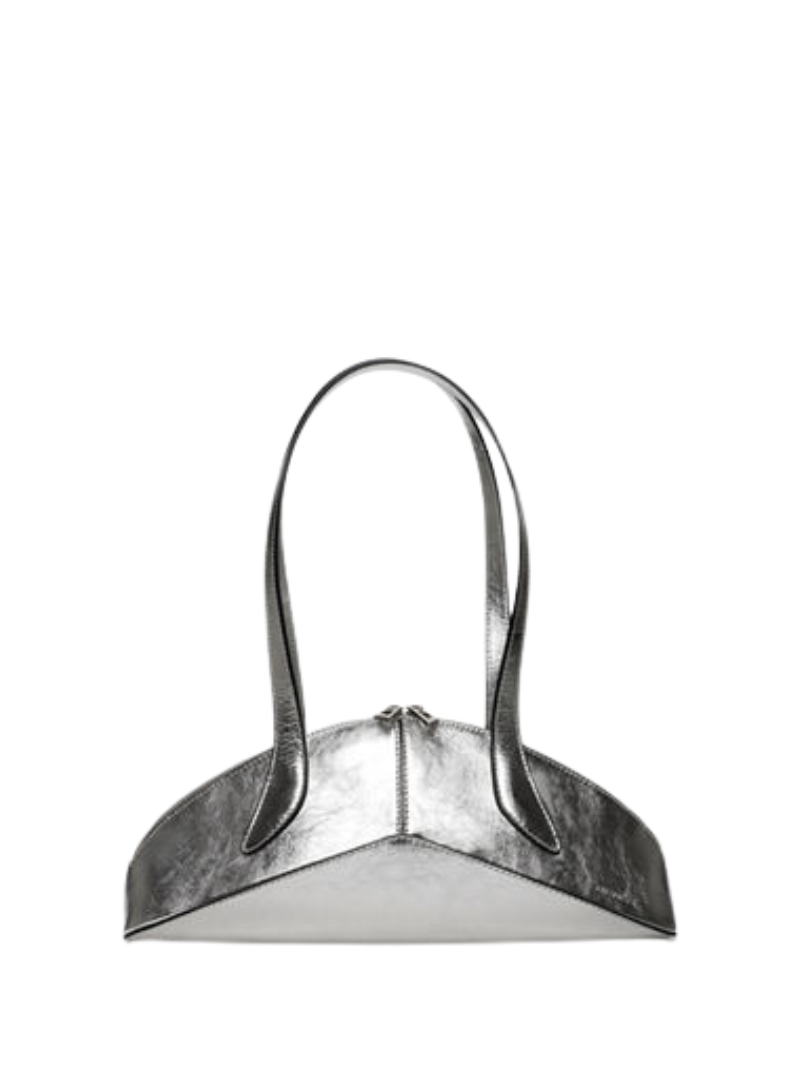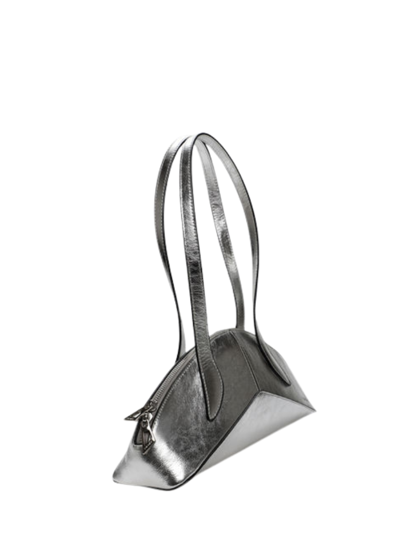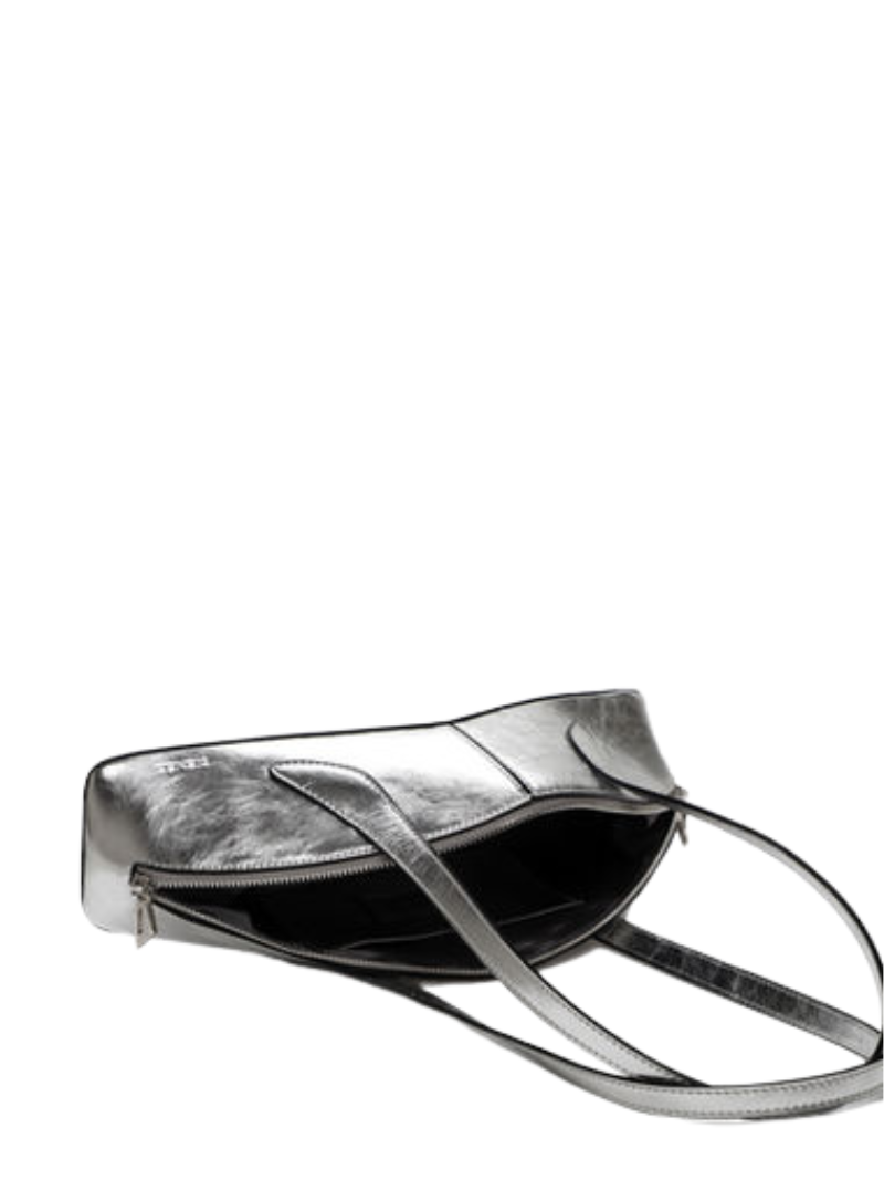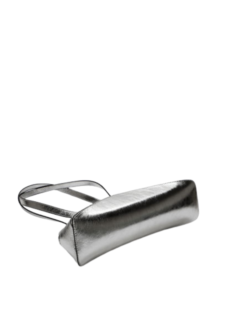 El bolso Arco plateado es una pieza de diseño contemporáneo elaborada en piel auténtica con acabado arrugado, que aporta textura, carácter y un aire sofisticado a cualquier look. Su silueta curvada y estructurada, inspirada en líneas arquitectónicas, lo convierte en un accesorio único y llamativo.
