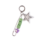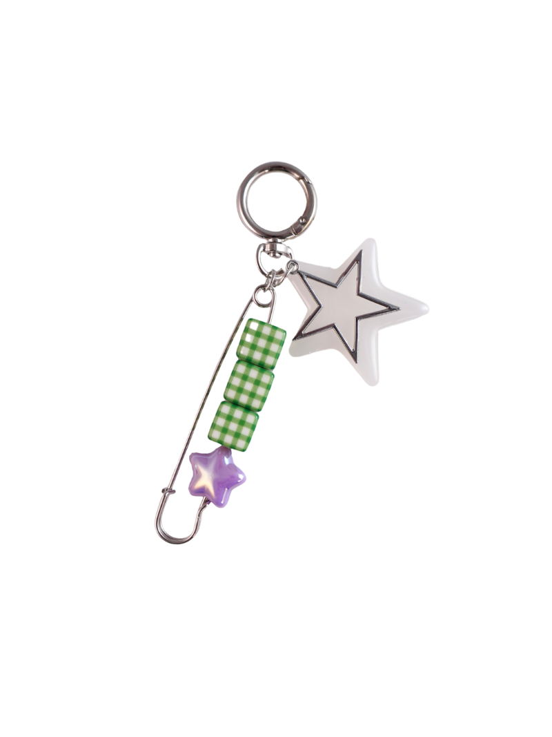 El charm Astra combina un imperdible con dos cubos de resina en estampado vichy verde y una estrella morada, también incluye una estrella blanca más grande acompañada de otra estrella metàlica. Un mix juguetón y pop que aporta ese toque divertido (y con mucha actitud) a cualquier bolso.