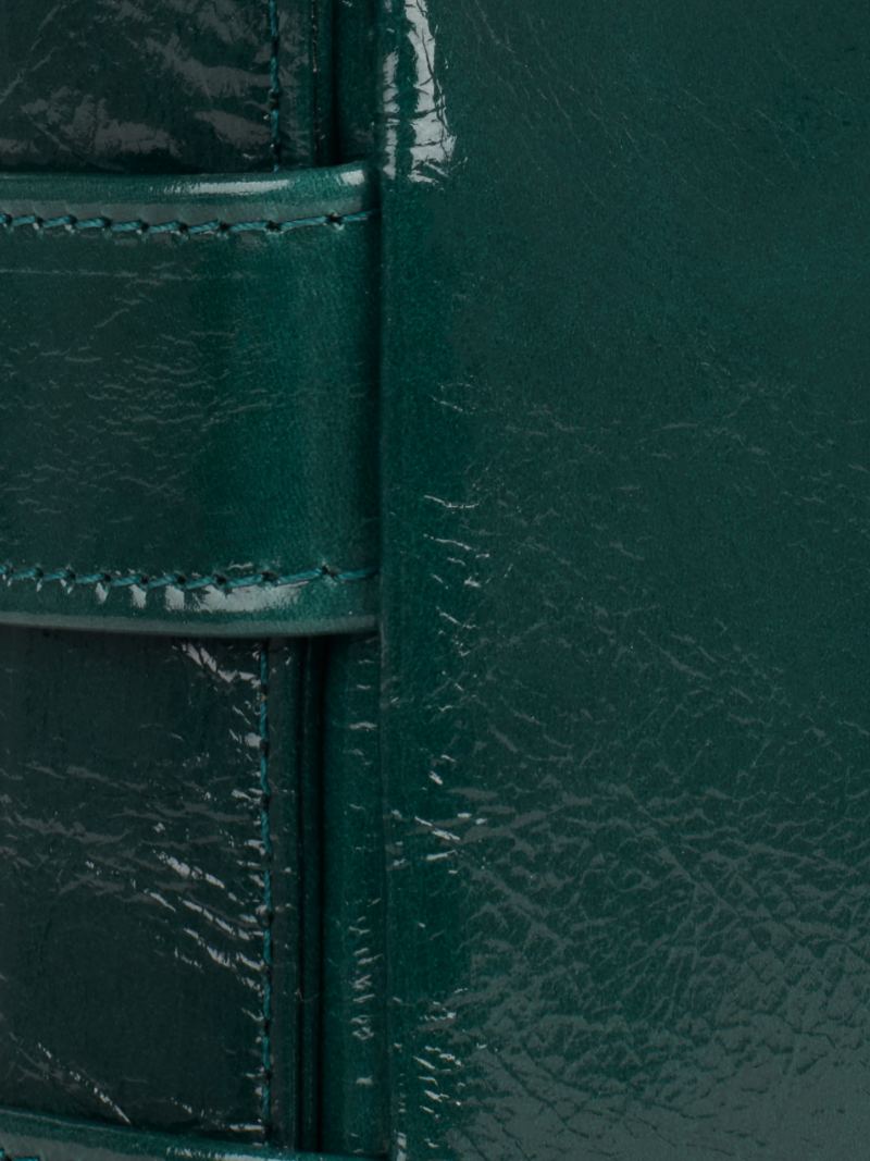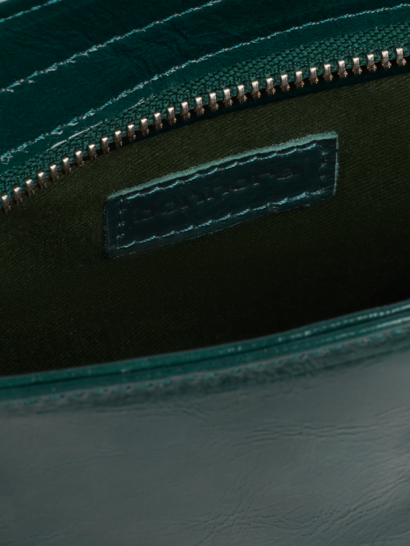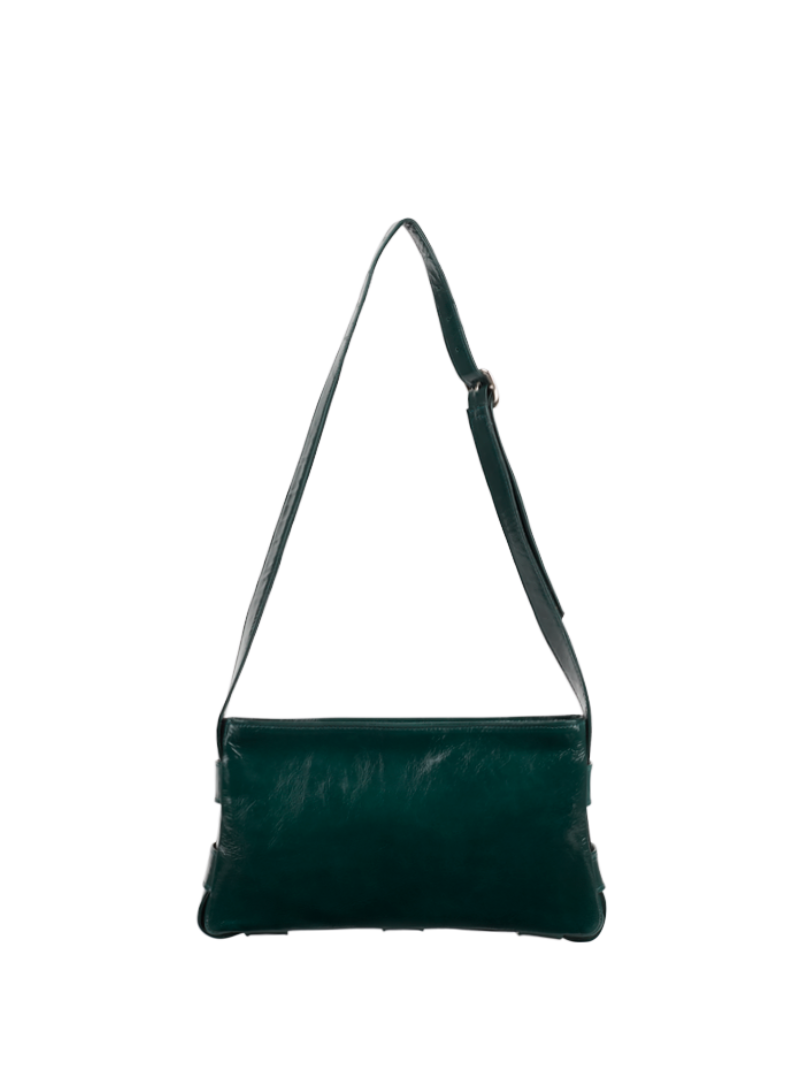 Bolso de piel pequeño en color verde pino hecho a mano en España con un diseño moderno. Gracias a la correa ajustable puede llevarse tanto de hombro como cruzado, perfecto para cualquier estilo.