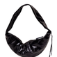 Bolso negro acharolado de cuero con un forro de 100% algodón. Este bolso se cierra con cremallera y cuenta con tiradores de cuero.