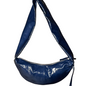 Bolso color azul noche de cuero brillante con un forro de 100% algodón. Este bolso se cierra con cremallera y cuenta con tiradores de cuero.