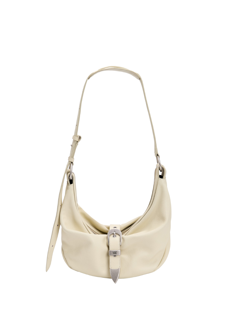 Bolso Margesherwood crema de piel en tamaño mediano. El modelo Belted hobo medium se caracteriza por su hebilla decorativa en plateado en la parte delantera del bolso.