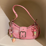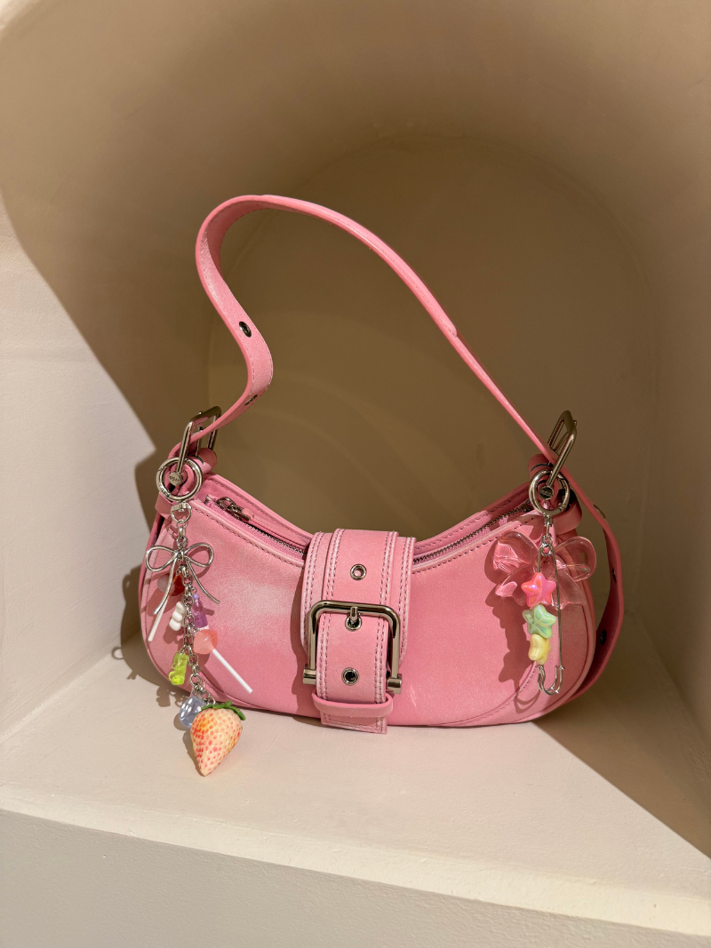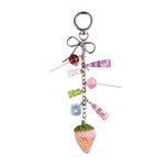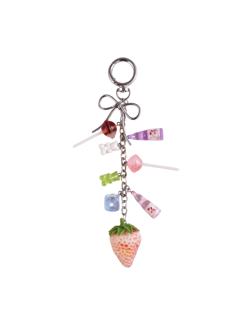 Charm metálico con una fresa blanca rodeada de piruletas, botellitas de soda, gummy bears, un dado y un lazo plateado. Un mix irresistible que parece una pijama party entre snacks kawaii y juegos de medianoche, dulce, atrevido y con mucho carácter.