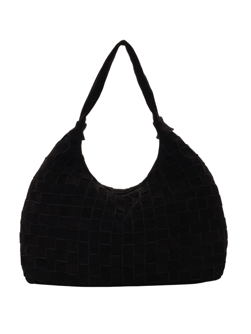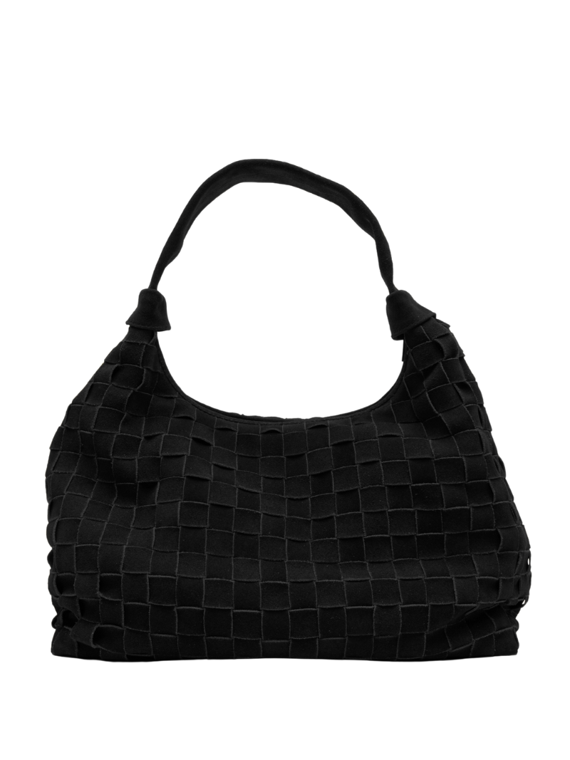 Diseño hobo de piel con diseño trenzado y asa enrollada en la parte superior.