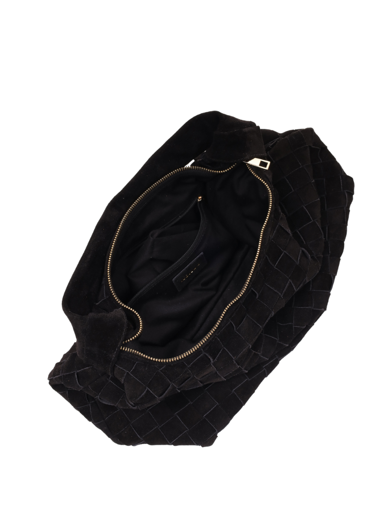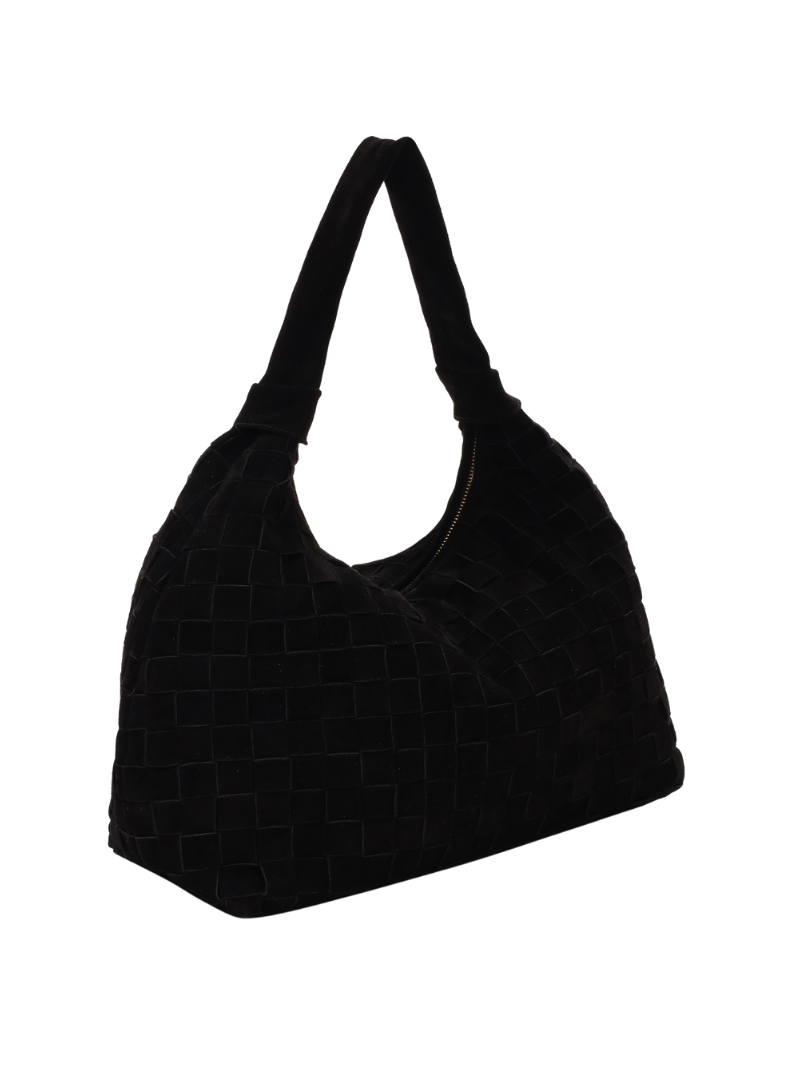 Bolso grande de hombro de piel de ante, de piel con asa circular en la parte superior y cierre con cremallera hasta el tope.