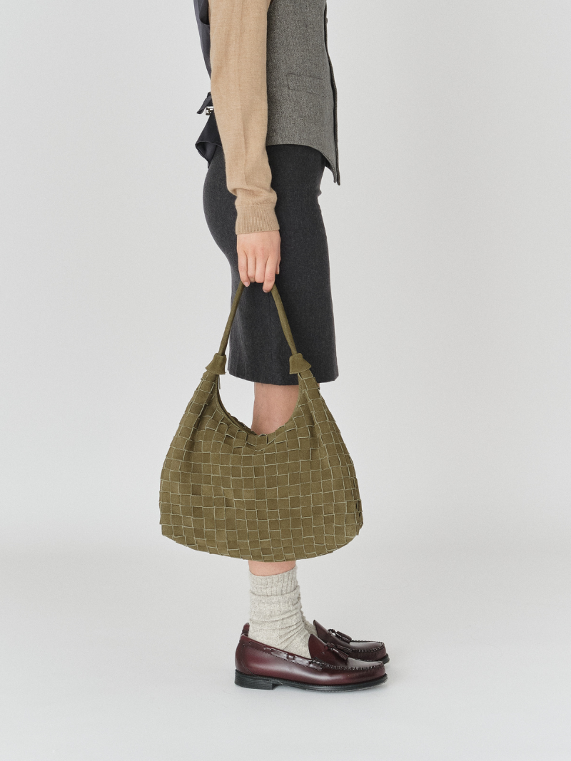 Diseño hobo de piel con diseño trenzado y asa enrollada en la parte superior.