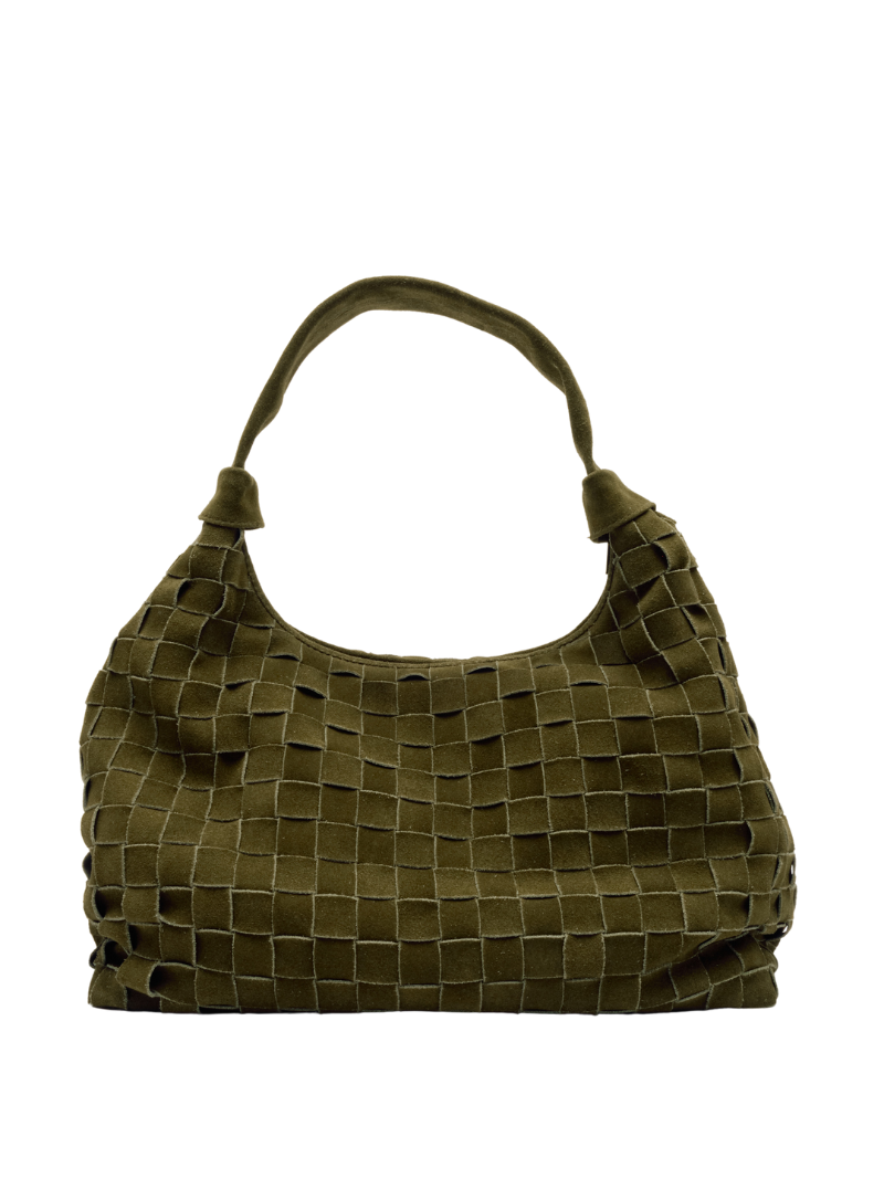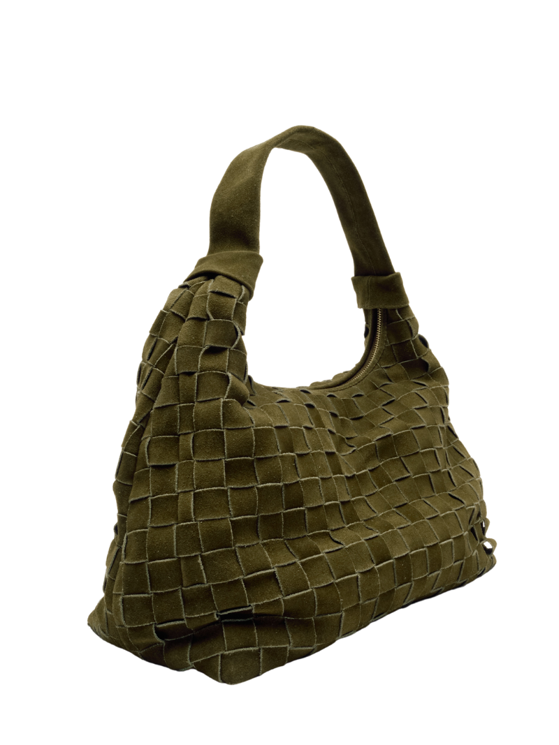 Bolso grande de hombro verde oscuro de ante, de piel con asa circular en la parte superior y cierre con cremallera hasta el tope.