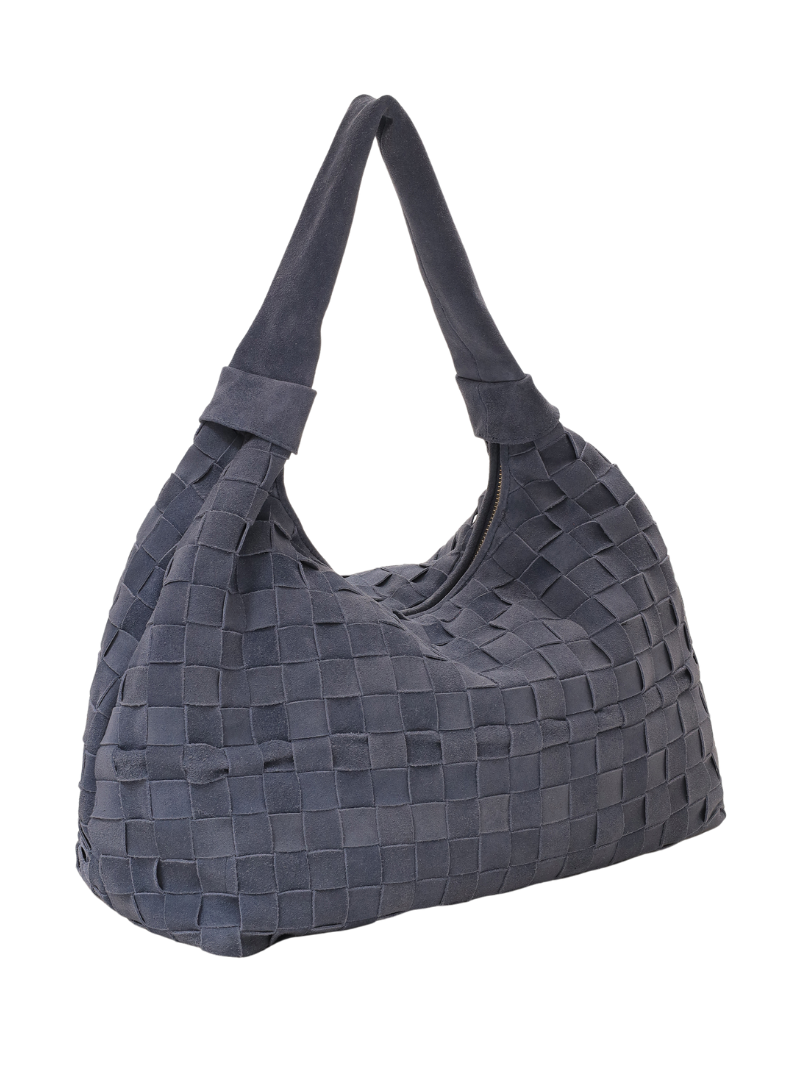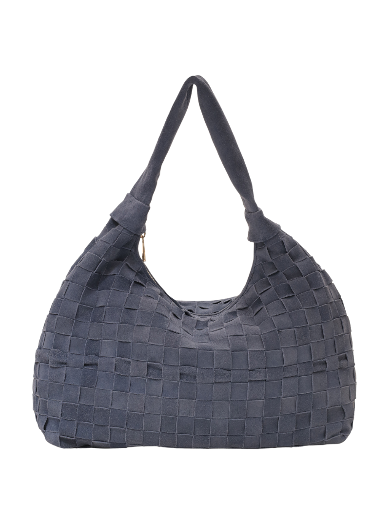 Bolso de ante azul grande de hombro, de piel con asa circular en la parte superior y cierre con cremallera hasta el tope.